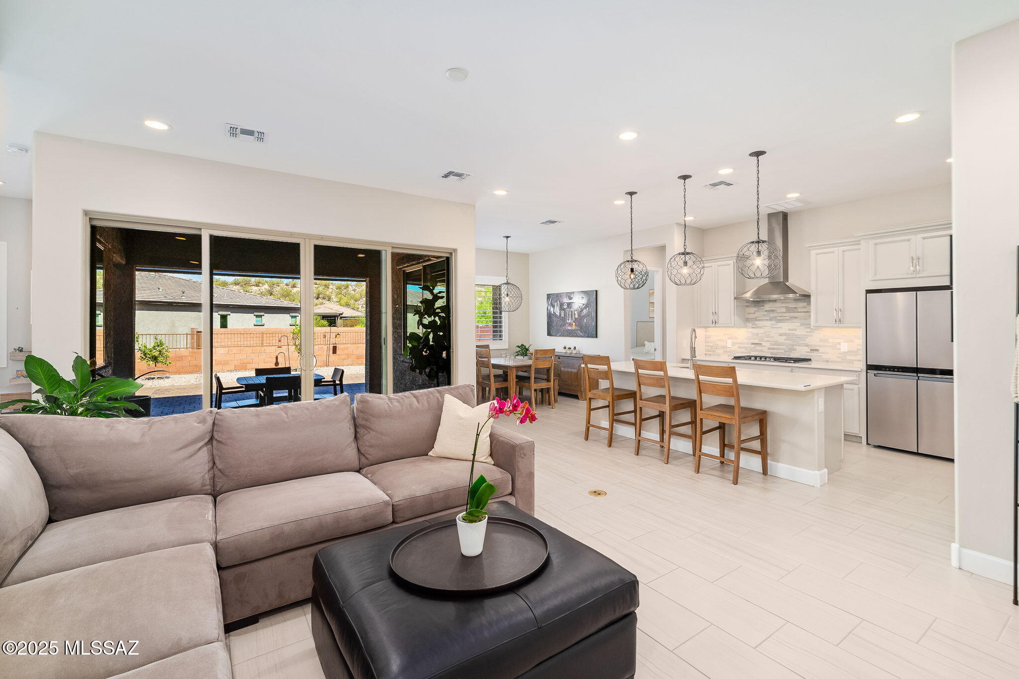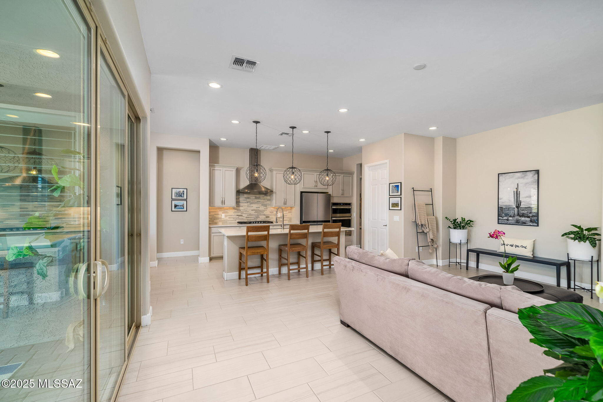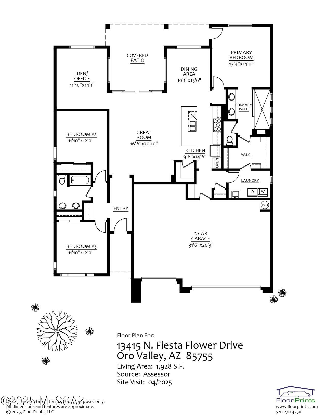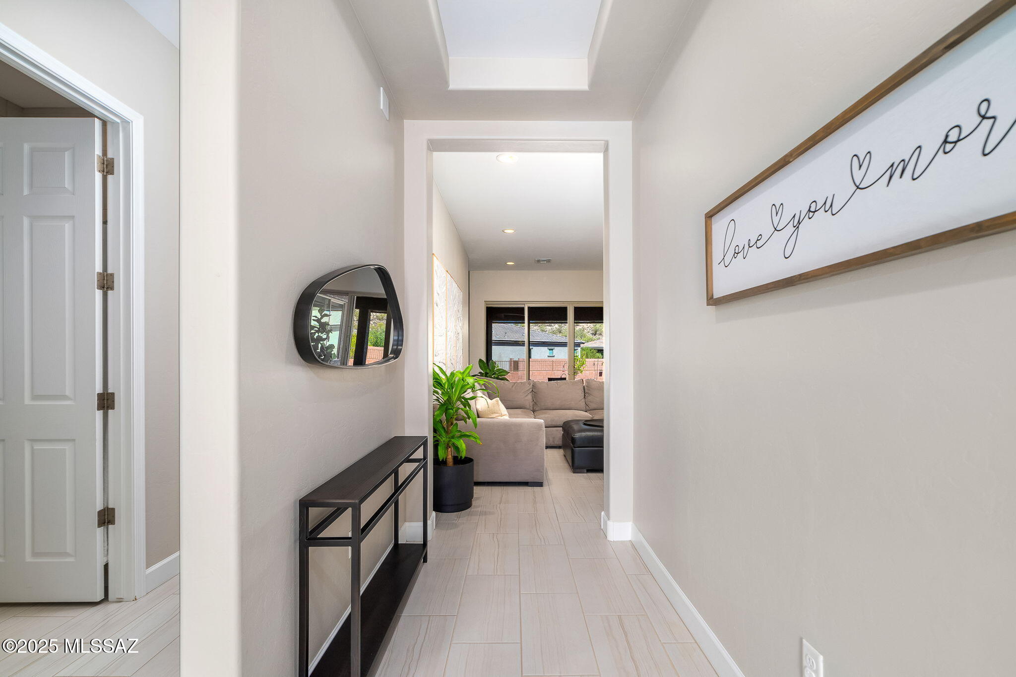 Located in the heart of Oro Valley in a small, gated community, Alterra at Vistoso Trails, 13415 N Fiesta Flower Drive offers residents a move-in-ready home with great amenities close by. Situated on a corner lot and abutting open land, the property is well positioned. Inside the 1928 square foot residence, you will find 3 bedrooms, 2 bathrooms and a separate den. The split floor plan works well for a variety of uses. While the home was constructed in 2020, the space has been meticulously cared for and feels new. In 2025, the exterior was professionally sealed and painted with high quality Sherwin Williams products, and the roof was resealed. In the kitchen and baths, you will find higher tier cabinetry, quartz counters, and stainless appliances.