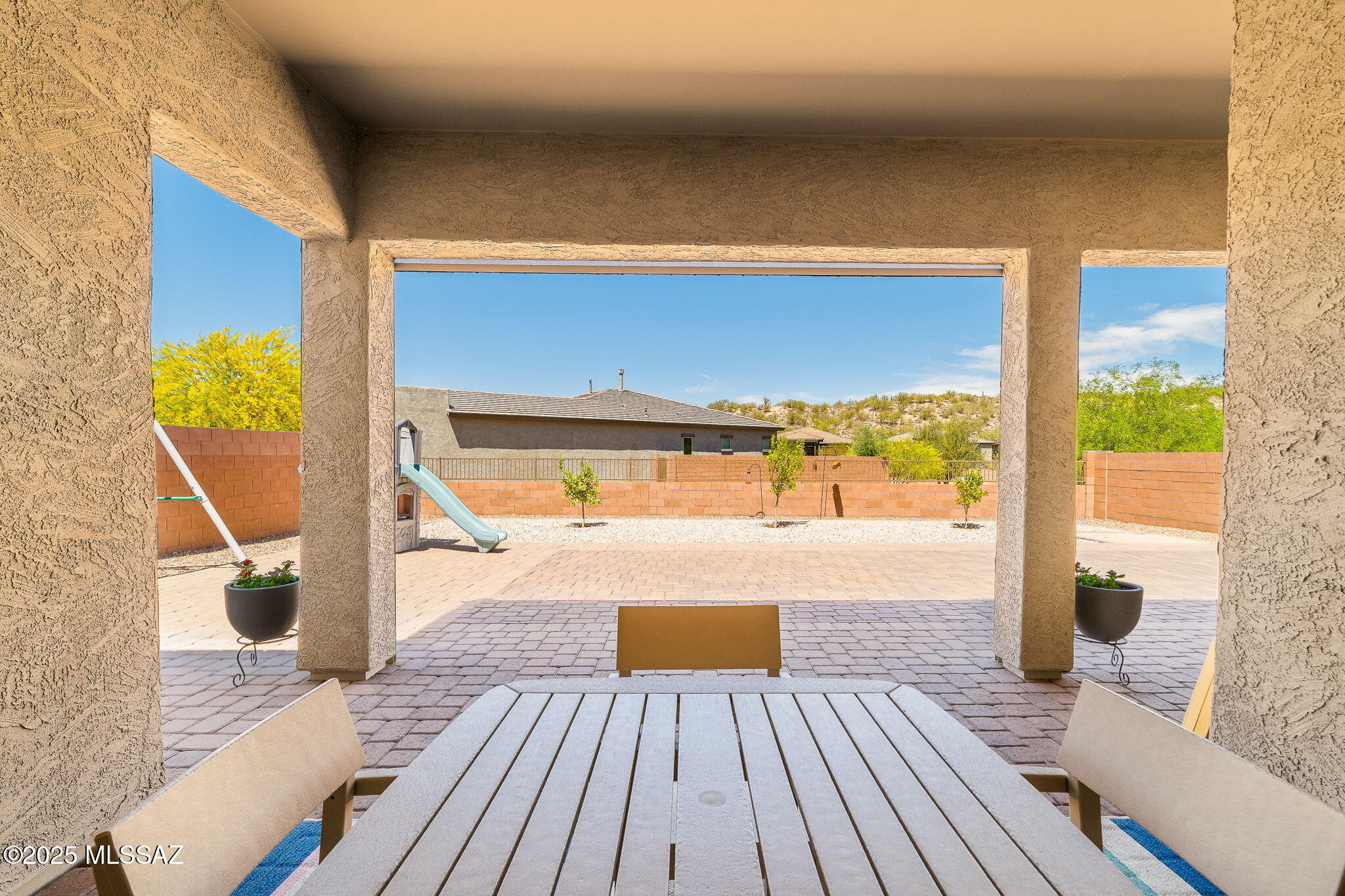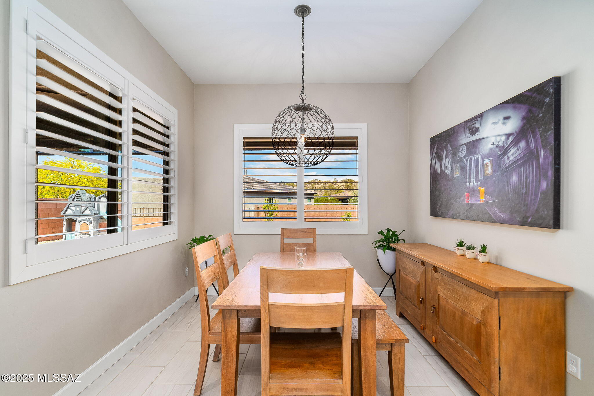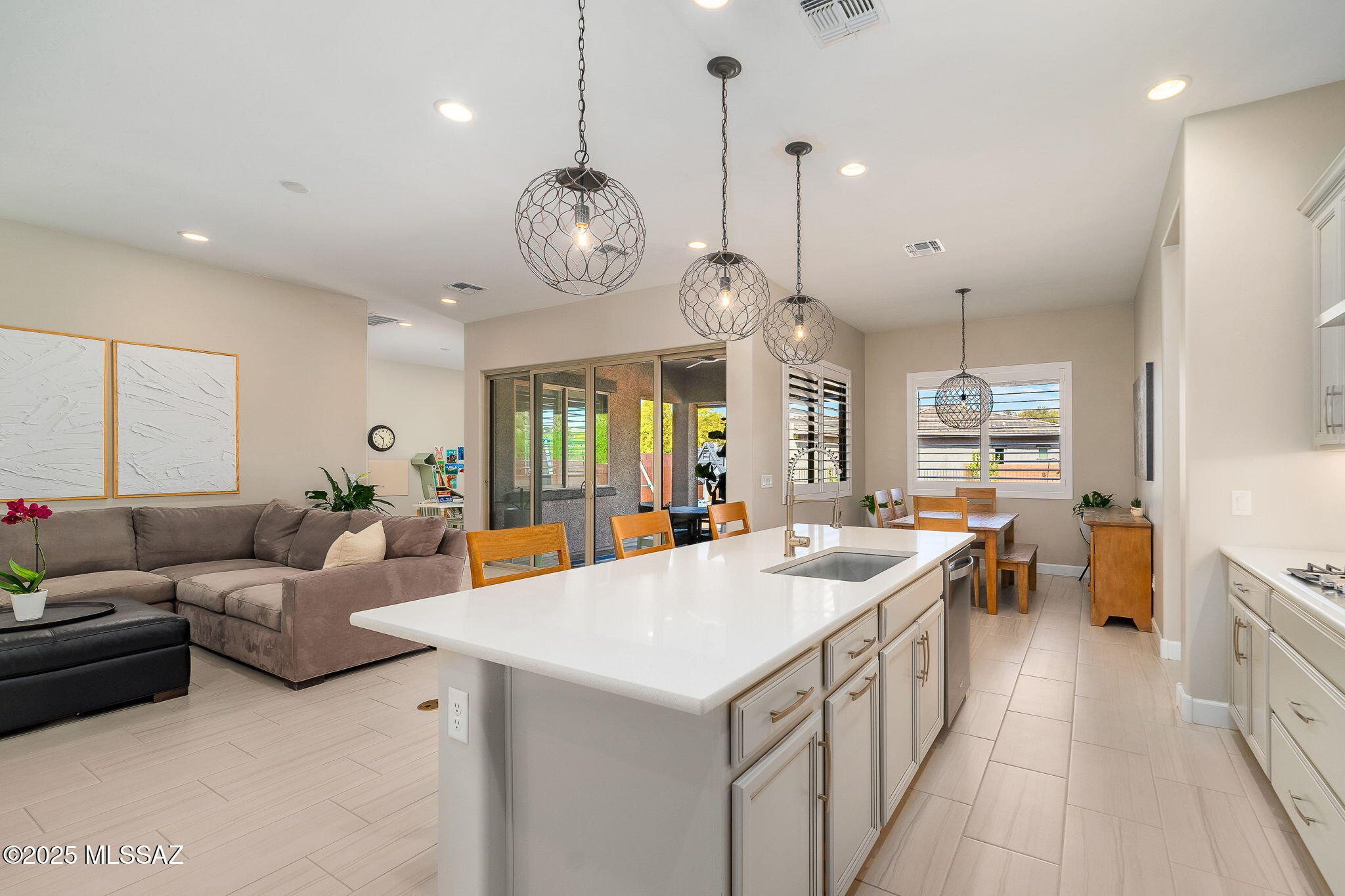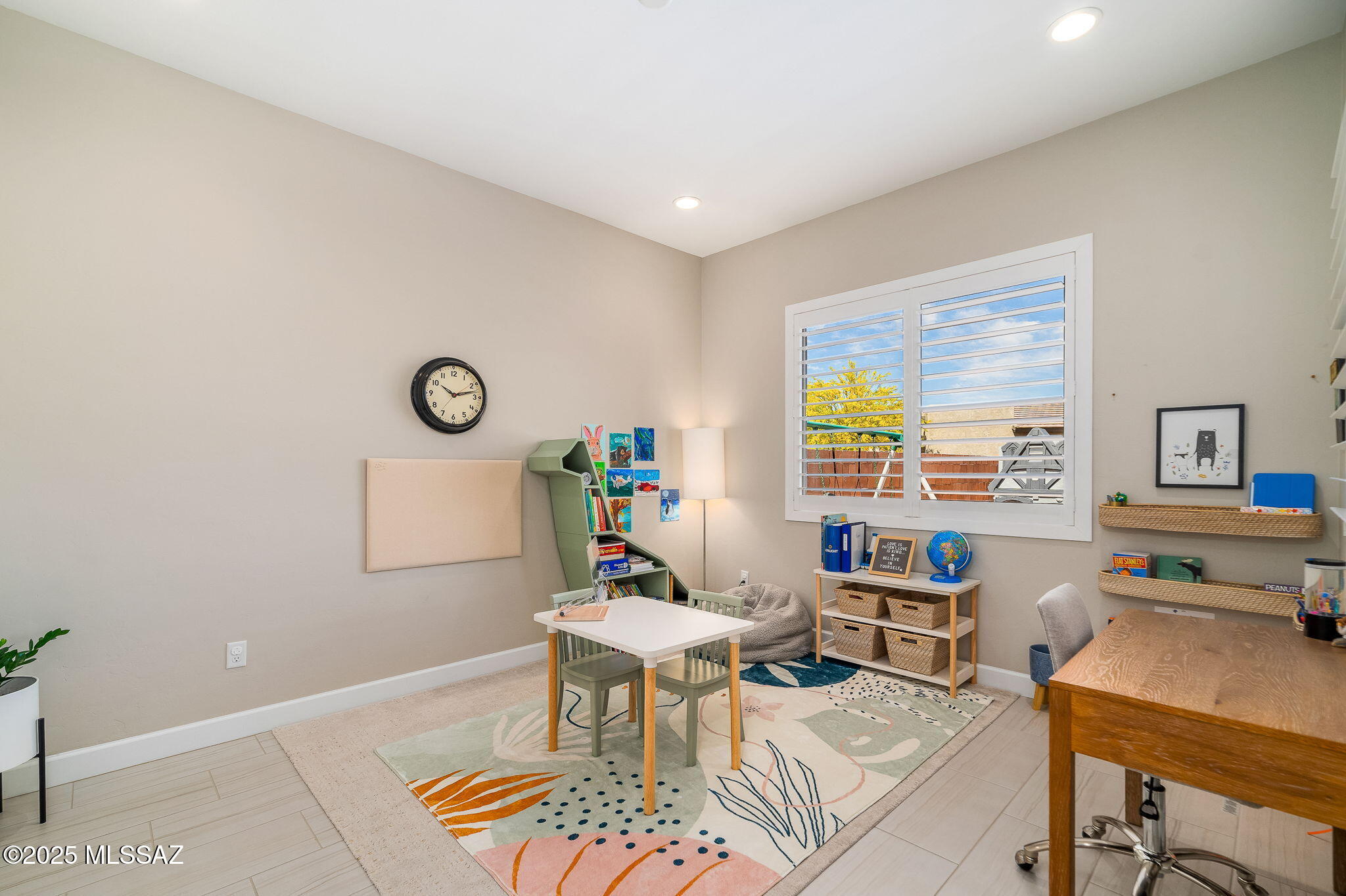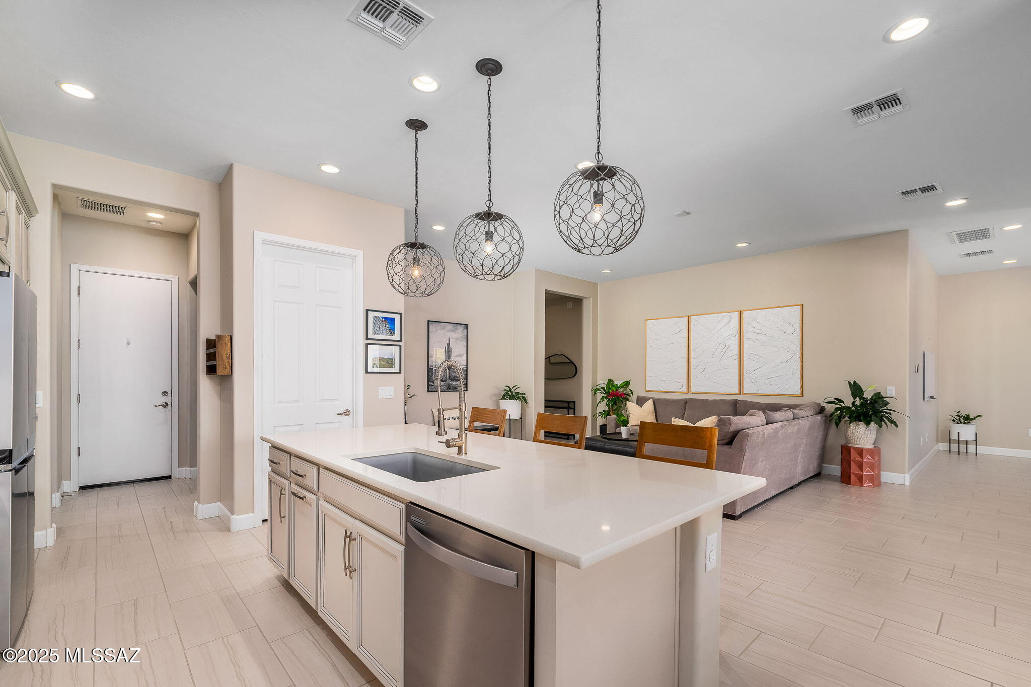Located in the heart of Oro Valley in a small, gated community, Alterra at Vistoso Trails, 13415 N Fiesta Flower Drive offers residents a move-in-ready home with great amenities close by. Situated on a corner lot and abutting open land, the property is well positioned. Inside the 1928 square foot residence, you will find 3 bedrooms, 2 bathrooms and a separate den. The split floor plan works well for a variety of uses. While the home was constructed in 2020, the space has been meticulously cared for and feels new. In 2025, the exterior was professionally sealed and painted with high quality Sherwin Williams products, and the roof was resealed. In the kitchen and baths, you will find higher tier cabinetry, quartz counters, and stainless appliances.