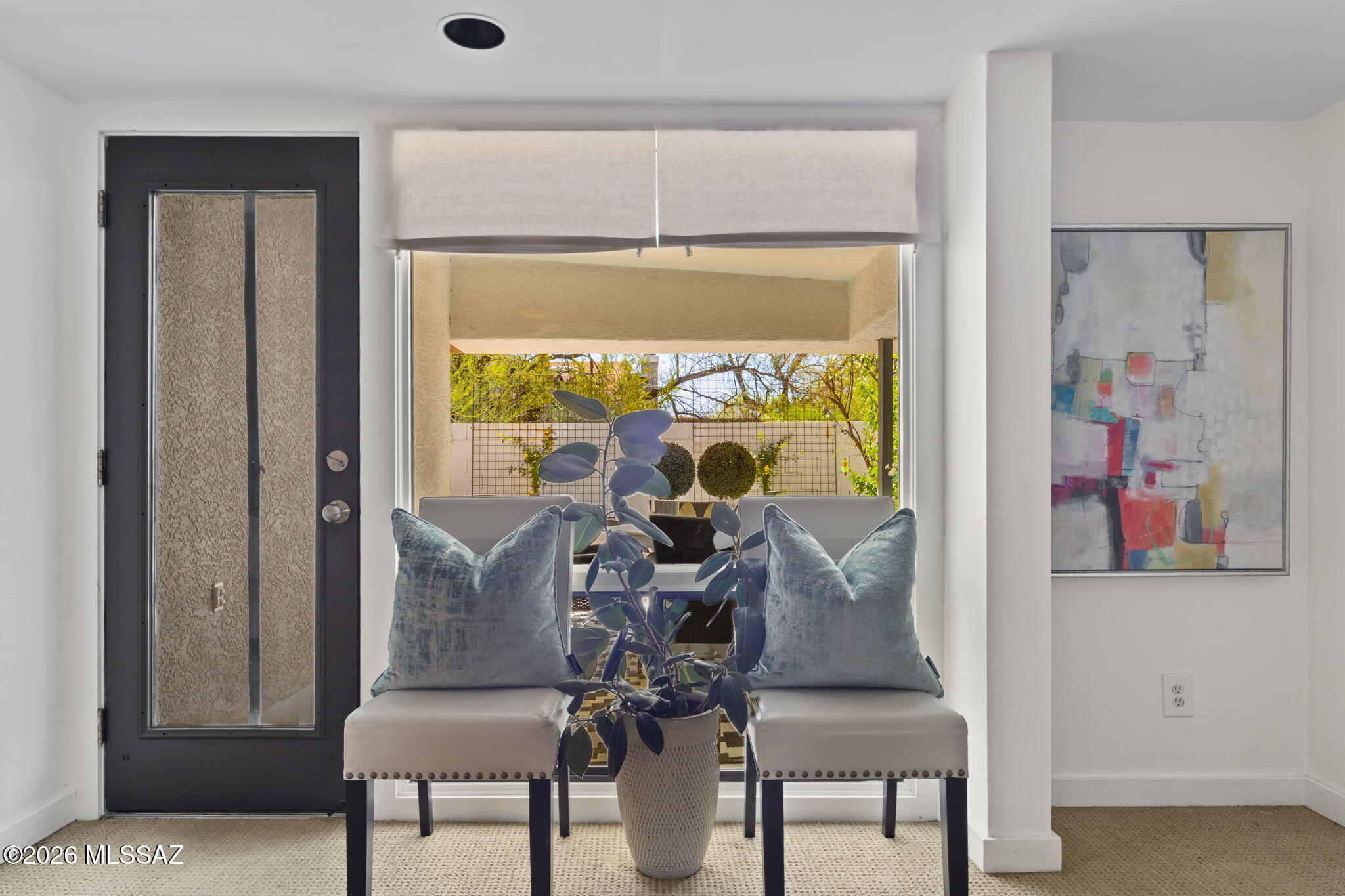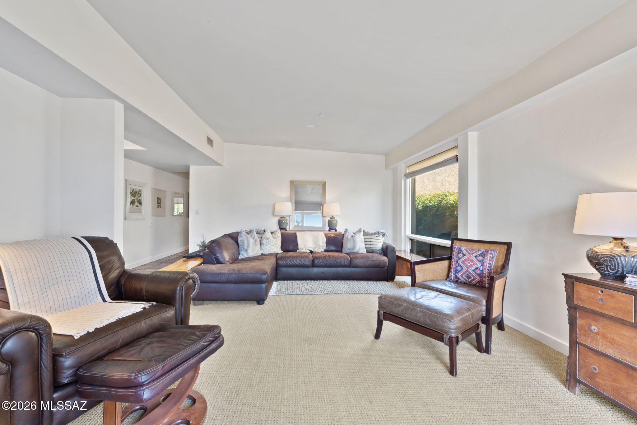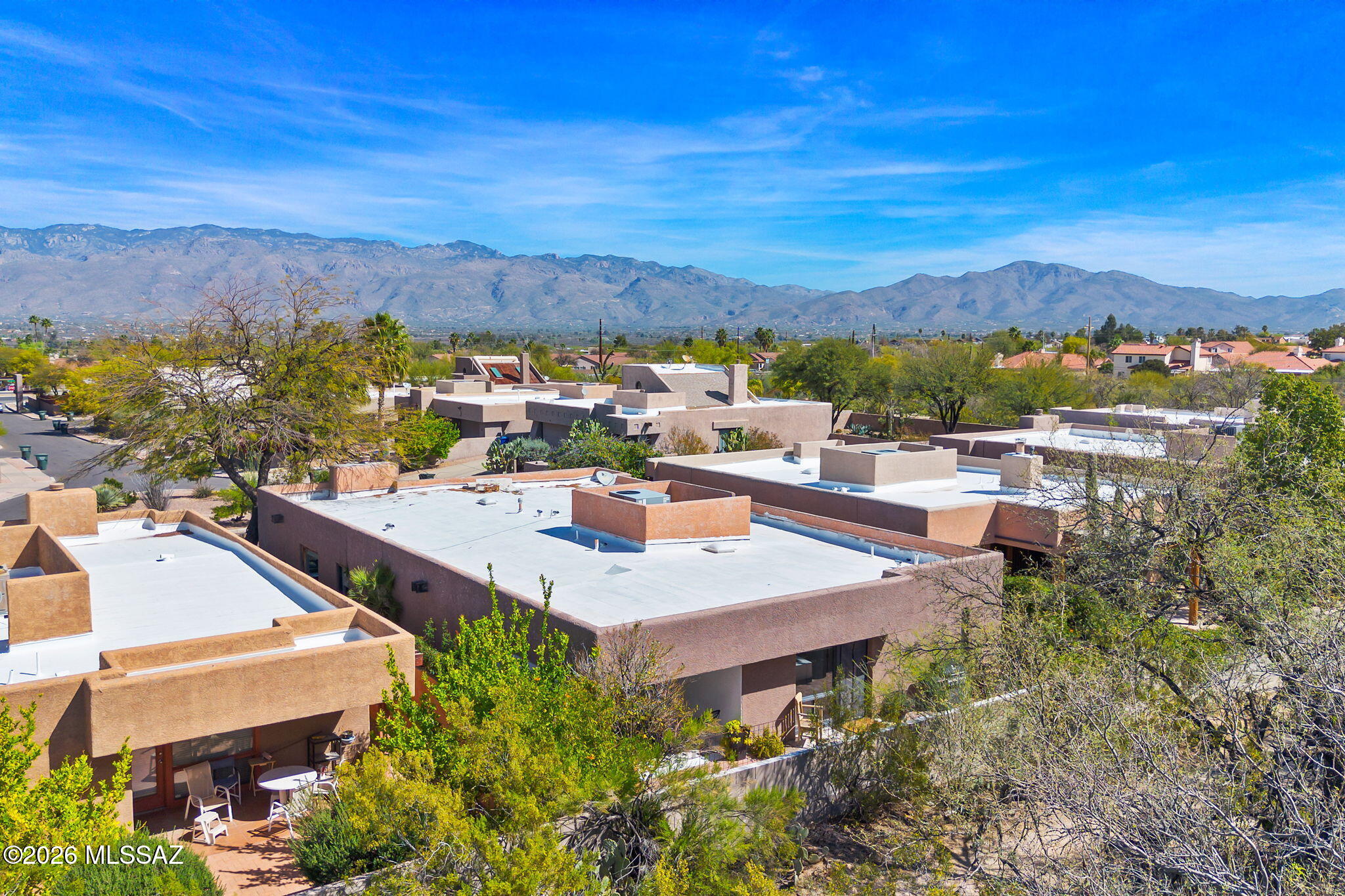 Welcome to 137 S Shadow Creek Place in Broadway Court, a small enclave of architectural homes, conveniently located to access city amenities and open spaces. Designed by the well-known architect David Tyson, this home showcases clean lines, well placed windows and thoughtful design throughout. Situated with open space and greenery behind, the property feels tucked away. Inside the 2,040 sq ft residence, you will find dual living spaces, 4 bedrooms and 2 full bathrooms. Anchoring the living room and entry, an offset gas fireplace is complemented by a large window with views of the Catalina Mountains. Touches of Saltillo tile bring in a bit of Southwest flair, while being balanced by more modern elements. Spaces feel warm, inviting and comfortable. The primary suite has private access to the outdoors, a walk-in closet, and a generous ensuite bath finished with travertine, a soaking tub and walk-in shower.