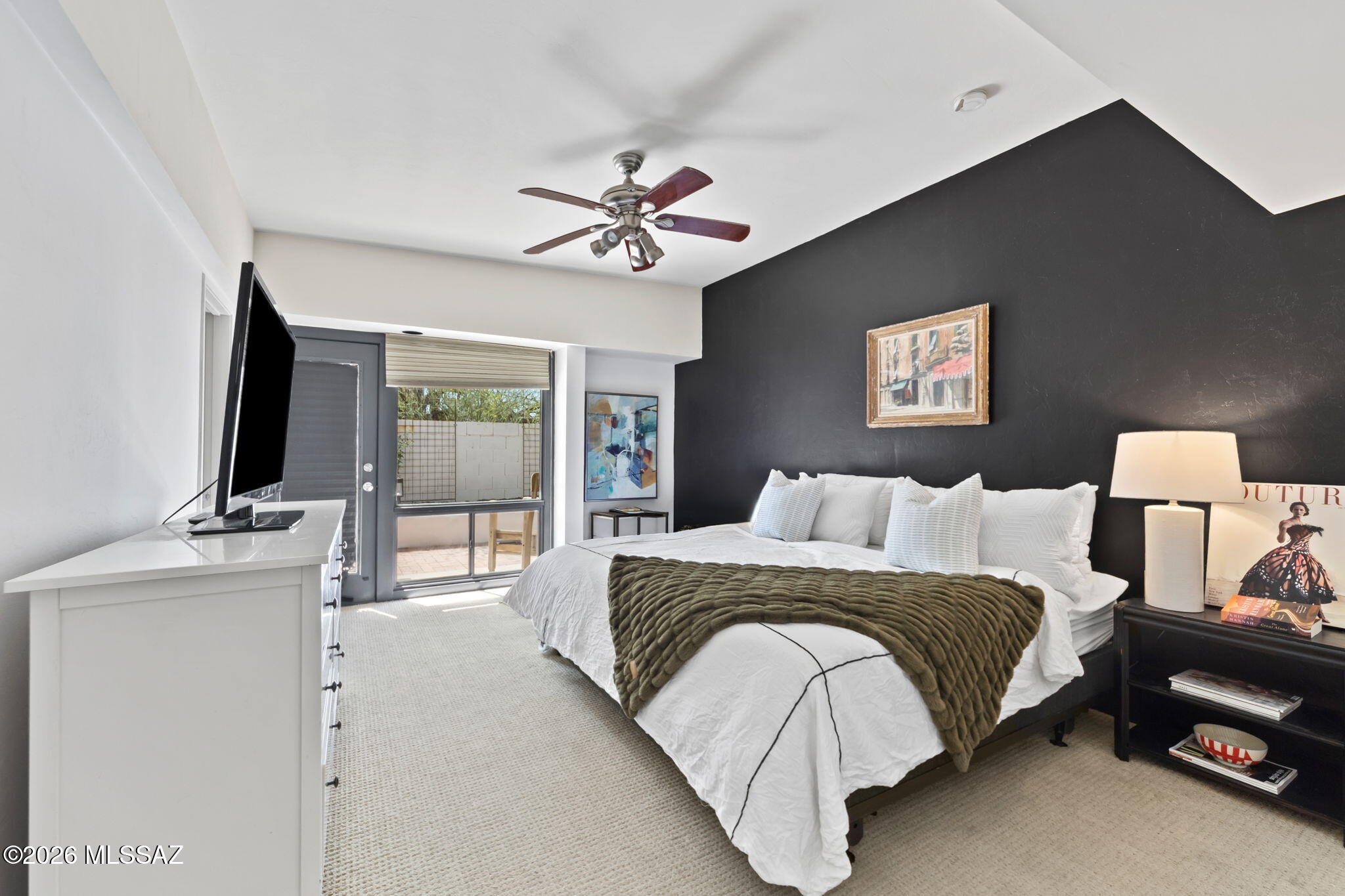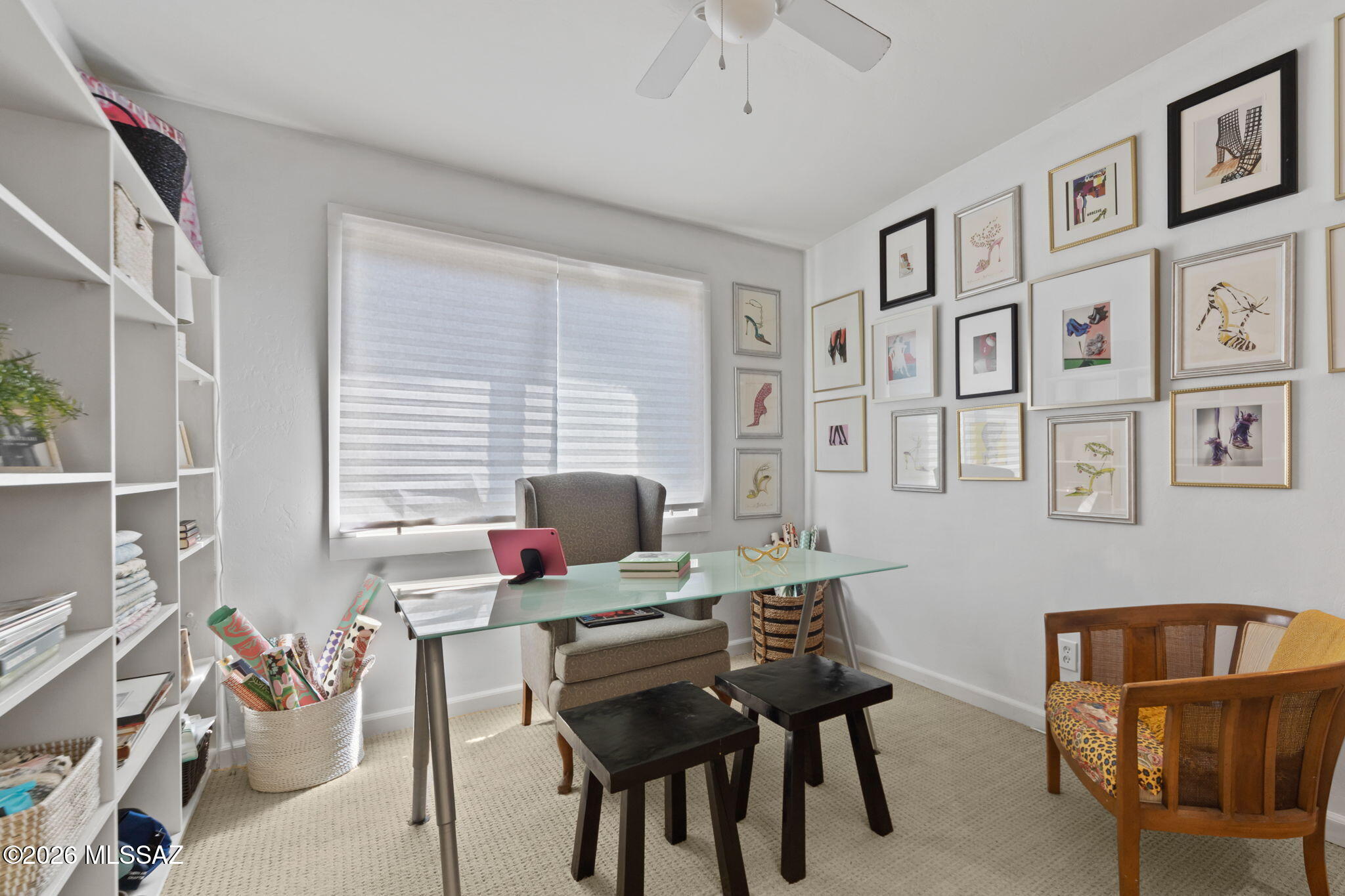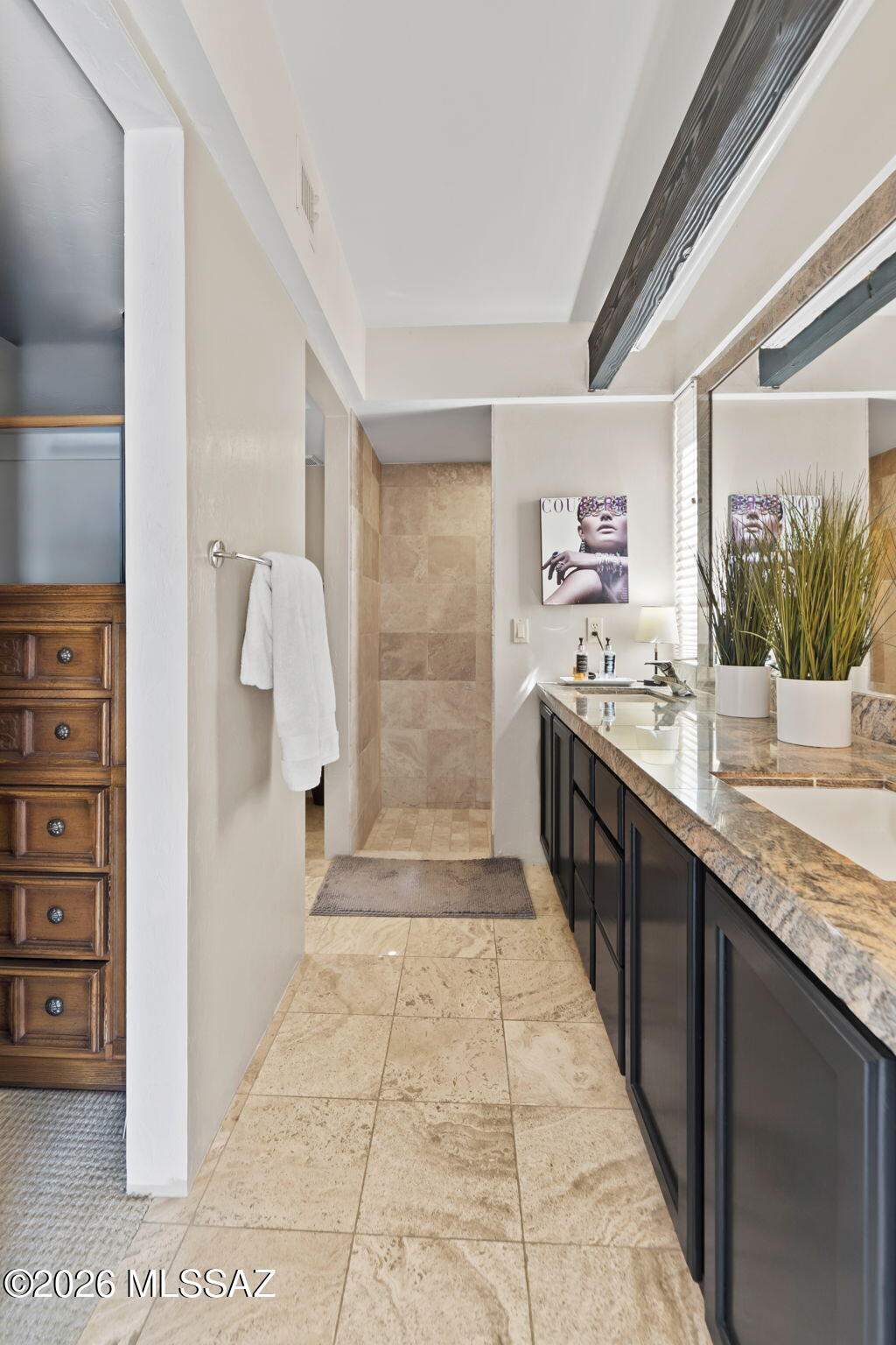 Welcome to 137 S Shadow Creek Place in Broadway Court, a small enclave of architectural homes, conveniently located to access city amenities and open spaces. Designed by the well-known architect David Tyson, this home showcases clean lines, well placed windows and thoughtful design throughout. Situated with open space and greenery behind, the property feels tucked away. Inside the 2,040 sq ft residence, you will find dual living spaces, 4 bedrooms and 2 full bathrooms. Anchoring the living room and entry, an offset gas fireplace is complemented by a large window with views of the Catalina Mountains. Touches of Saltillo tile bring in a bit of Southwest flair, while being balanced by more modern elements. Spaces feel warm, inviting and comfortable. The primary suite has private access to the outdoors, a walk-in closet, and a generous ensuite bath finished with travertine, a soaking tub and walk-in shower.