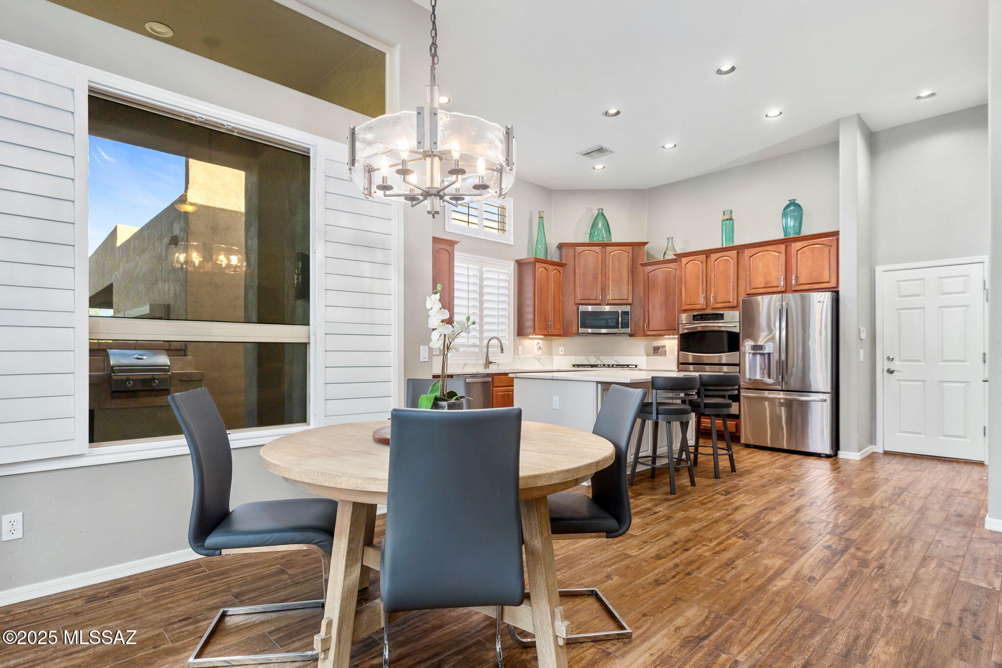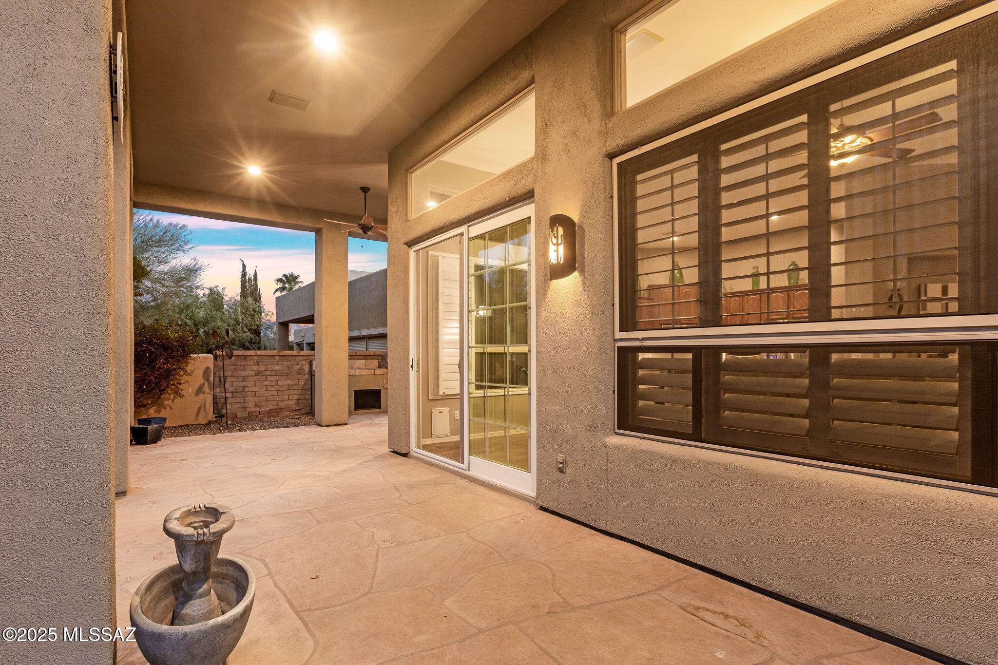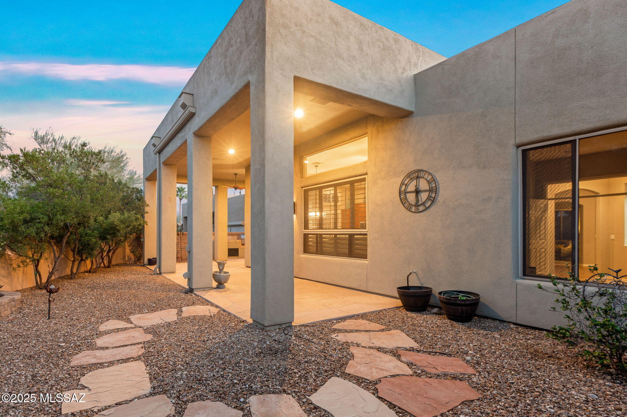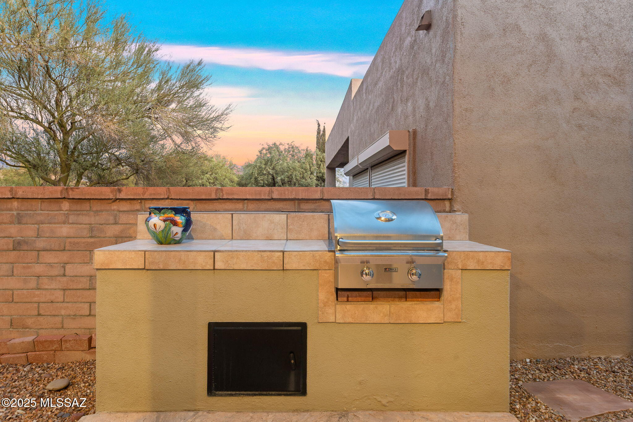 Facing Northeast with no rear neighbors, the backyard feels tucked in with generous vegetation and exposes peeks of the Catalina Mountains. A built-in grill invites residents to cook and dine outdoors.