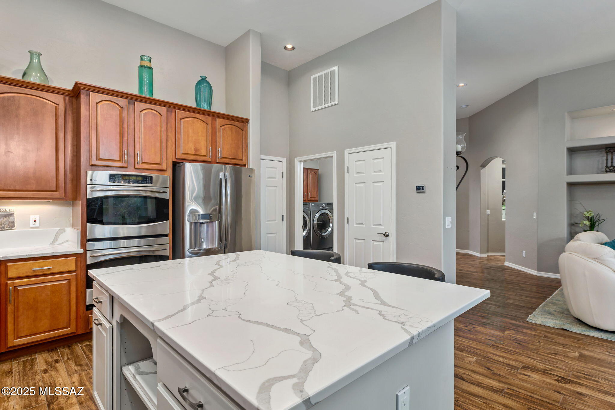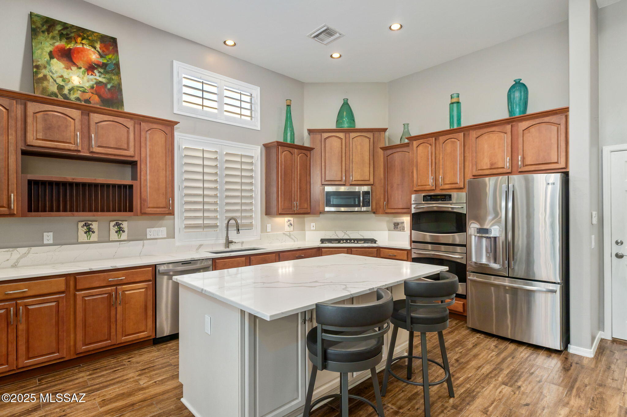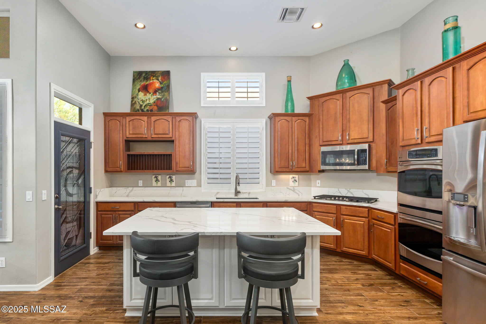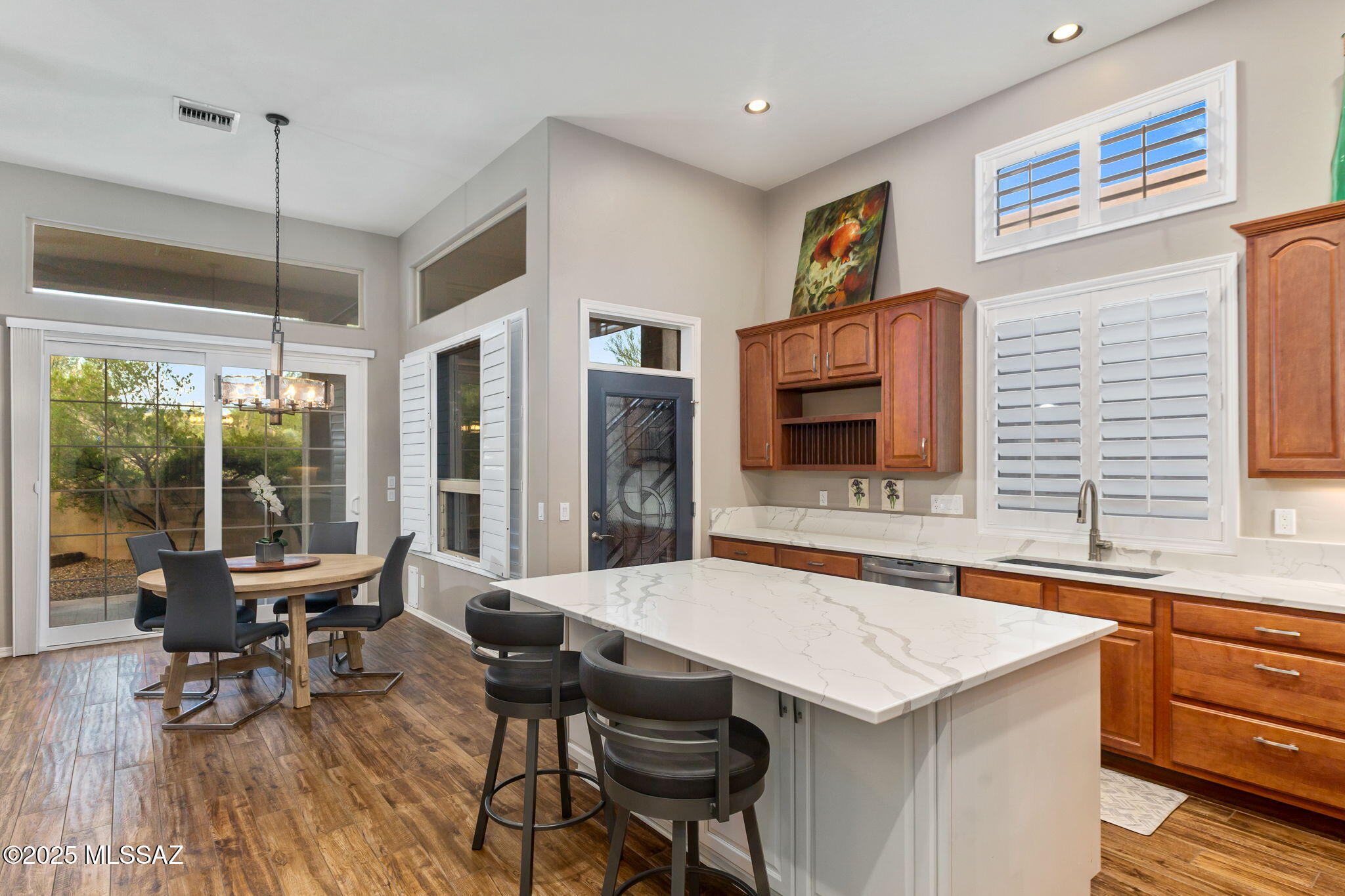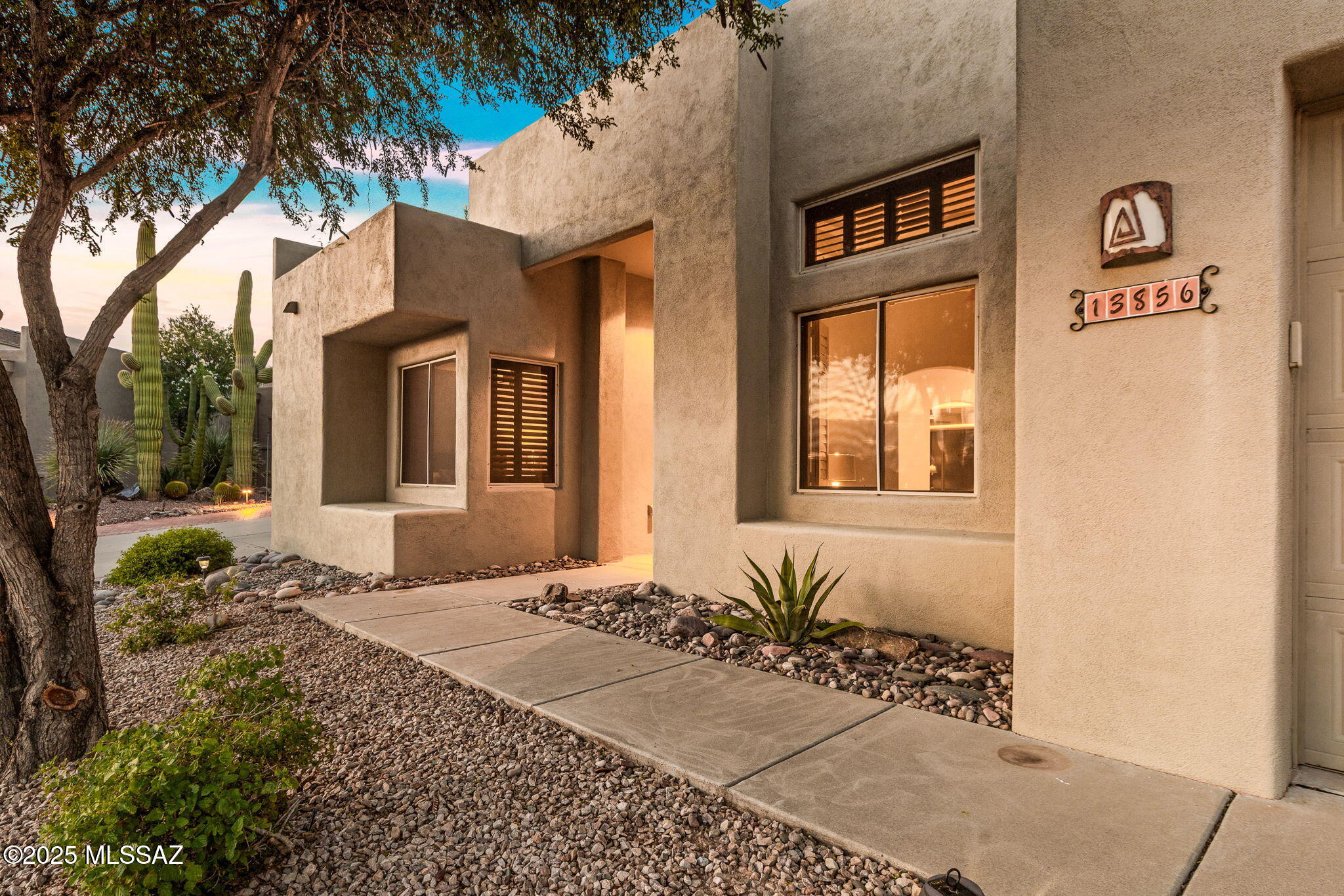 Located in the small, gated enclave of Fairfield in Rancho Vistoso where community, nature and convenience converge. Homes in this neighborhood are built with high quality materials and masonry construction. This setting lends itself to easy full-time living, or an excellent seasonal residence. Thoughtfully updated and lovingly cared for, 13856 N Maxfli Drive is ready to enjoy. The 1,941 sq ft floor plan includes 2 bedrooms, 2 bathrooms, a den and open living space with soaring ceilings. The generous entry welcomes residents into a space that feels calm and bright. Large windows let in abundant natural light and create visual pathways to the green vegetation outside.