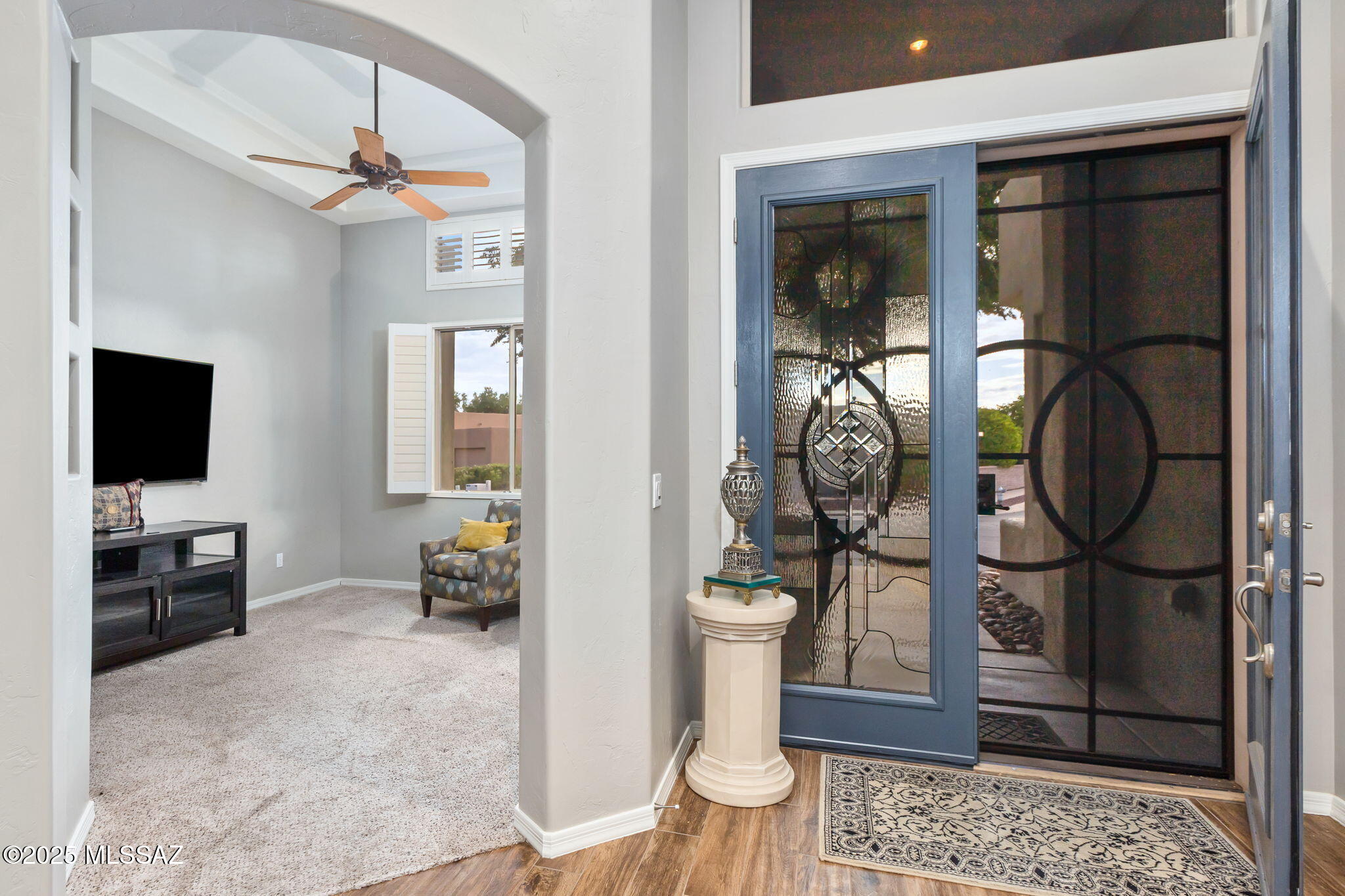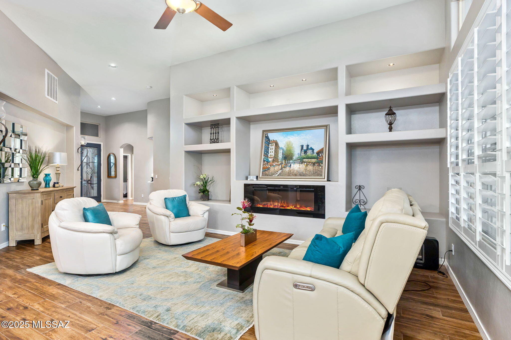 Core design elements are clean & modern: plank tile floors, fresh paint, plantation shutters and quartz countertops. Custom touches add a layer of warmth and comfort; art niches are dotted throughout, built in cabinetry is found in multiple locations, and an electric fireplace anchors the great room. With metal screen doors on both the front and back entrances, air flow through the home can be enjoyed.