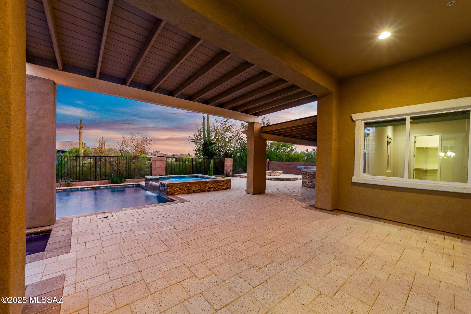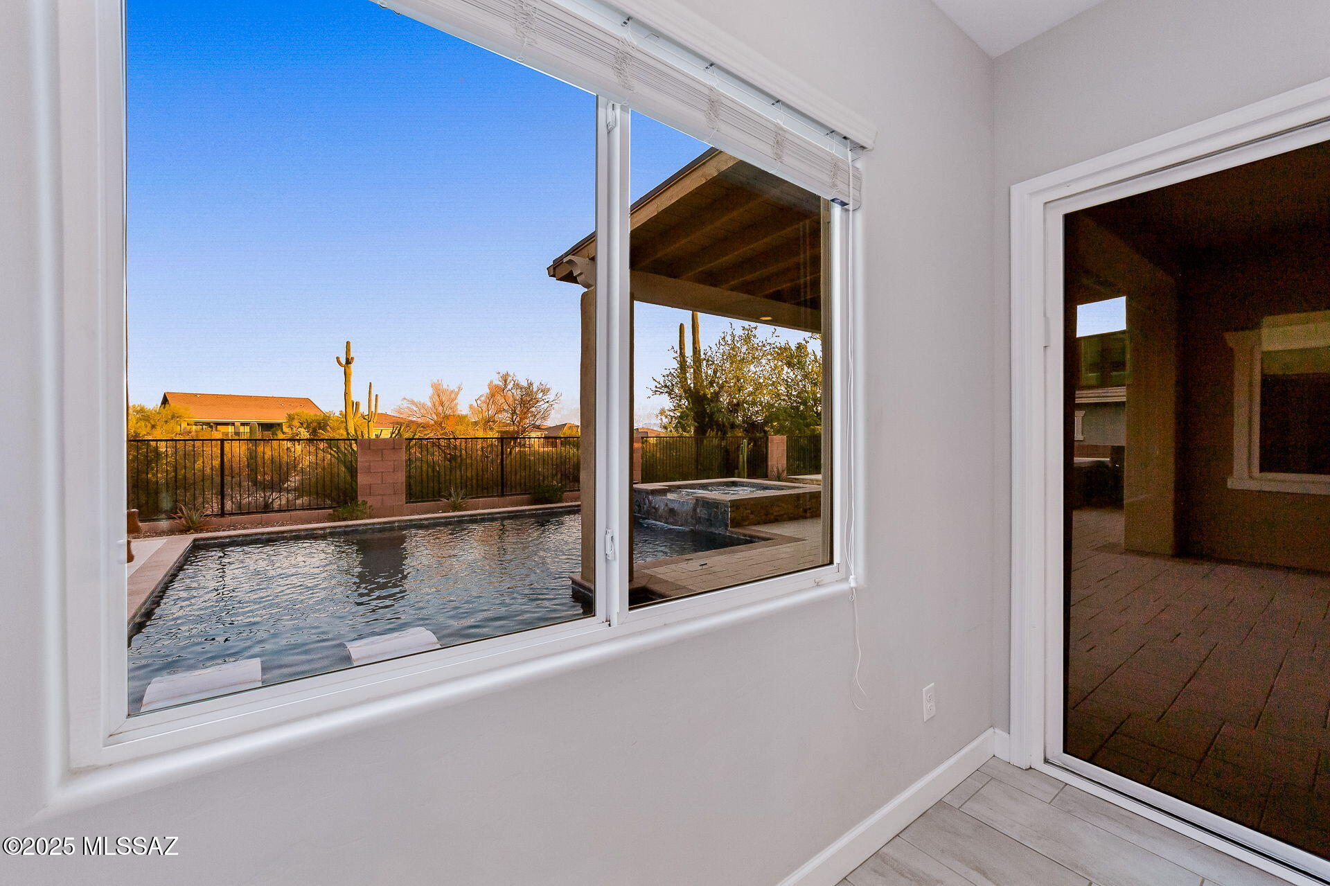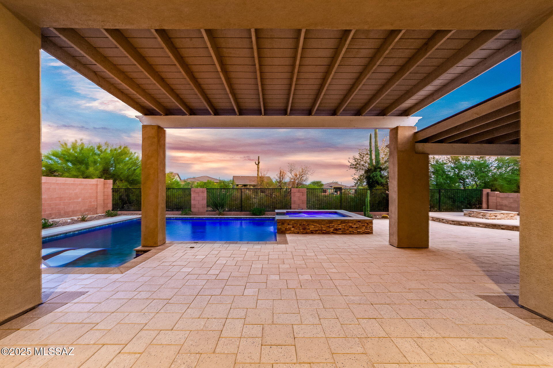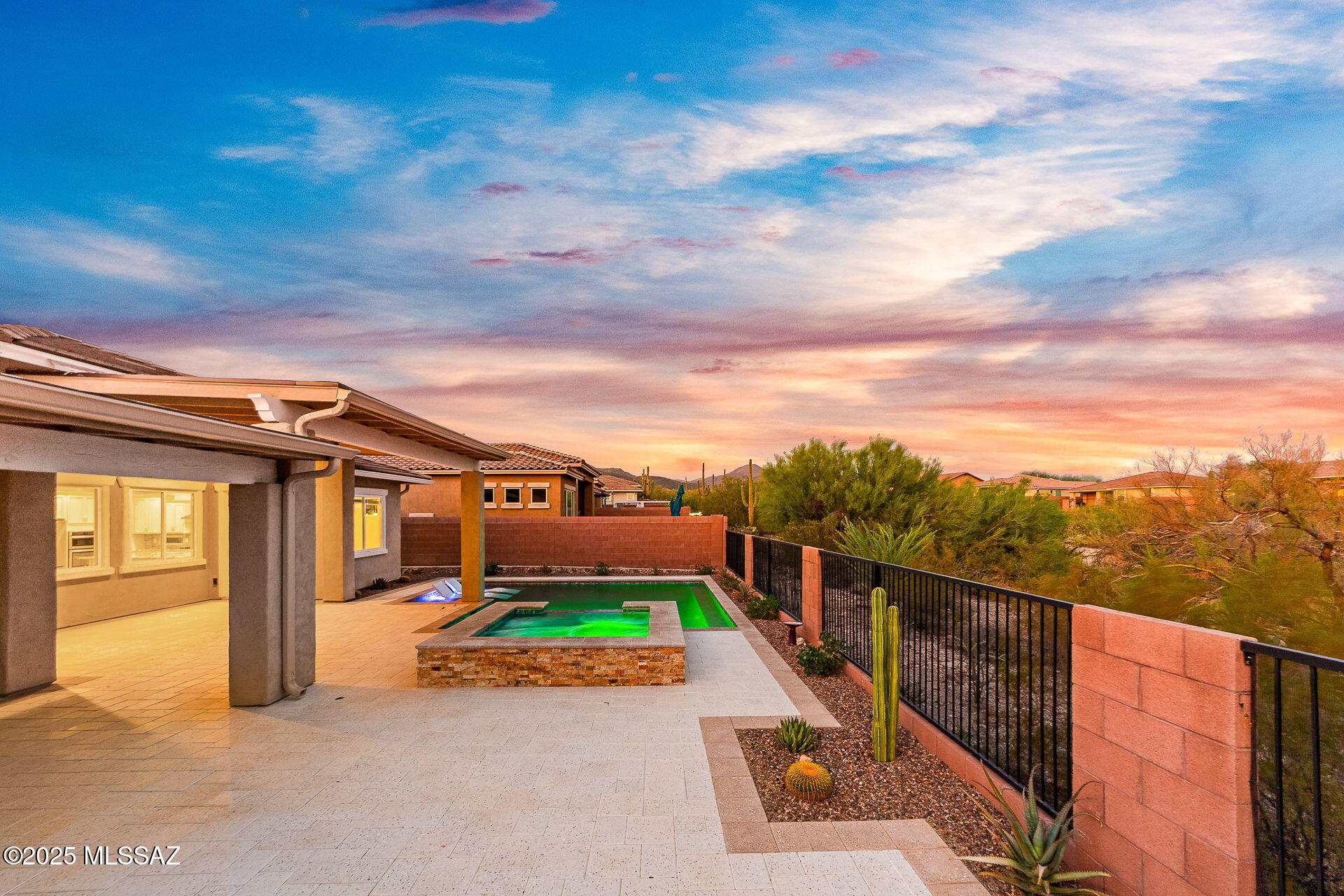 Resort-like living awaits at this Dove Mountain property, nestled within the gated community of Golden Barrell Place. The backyard is an entertainer's dream, offering a seamless indoor-outdoor lifestyle. A 12-foot roof extension on the back patio provides constant shade in every season. With a custom heated pool and spa, built-in BBQ, a dedicated prep area, and a gas fire pit, this backyard is perfectly set up for a full-time resident or seasonal visitor.