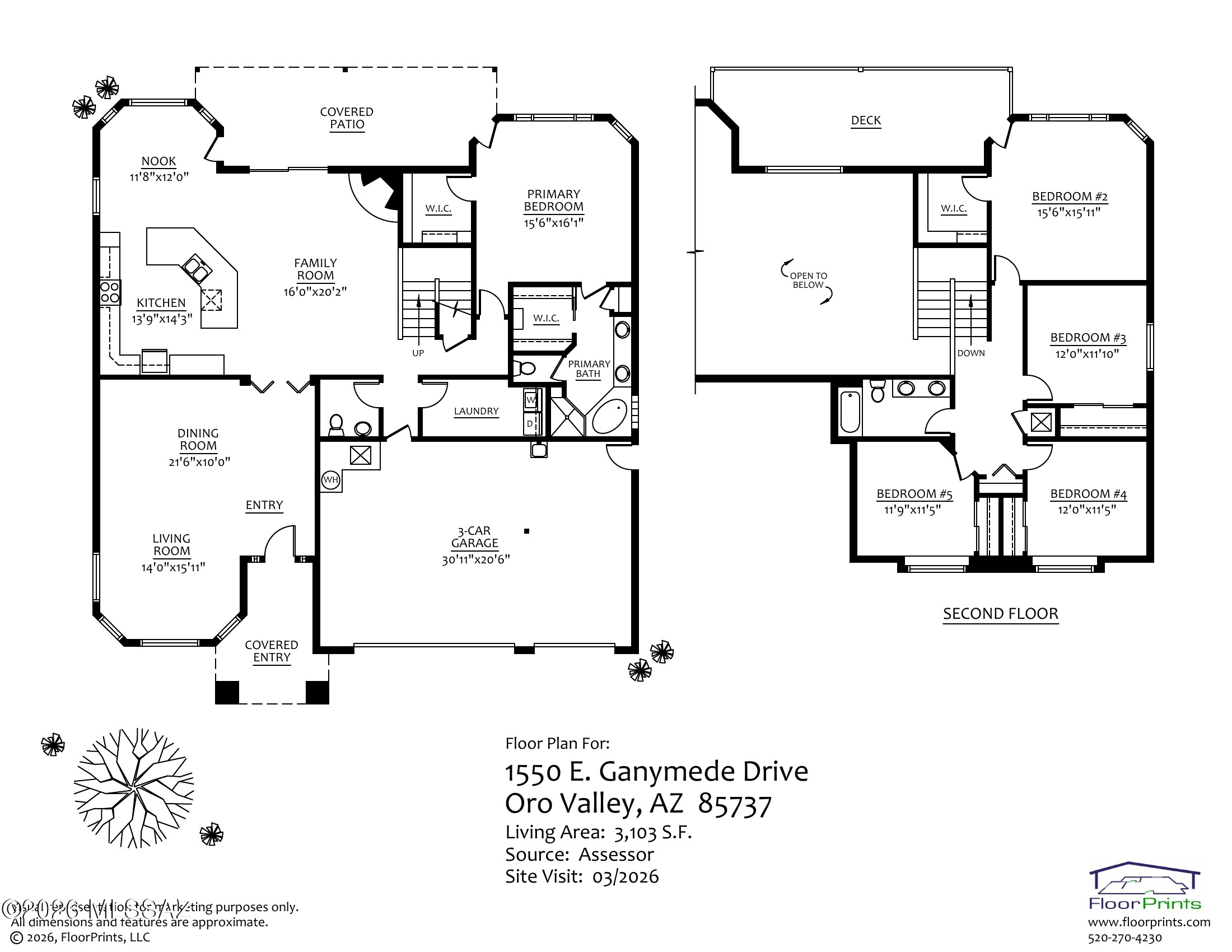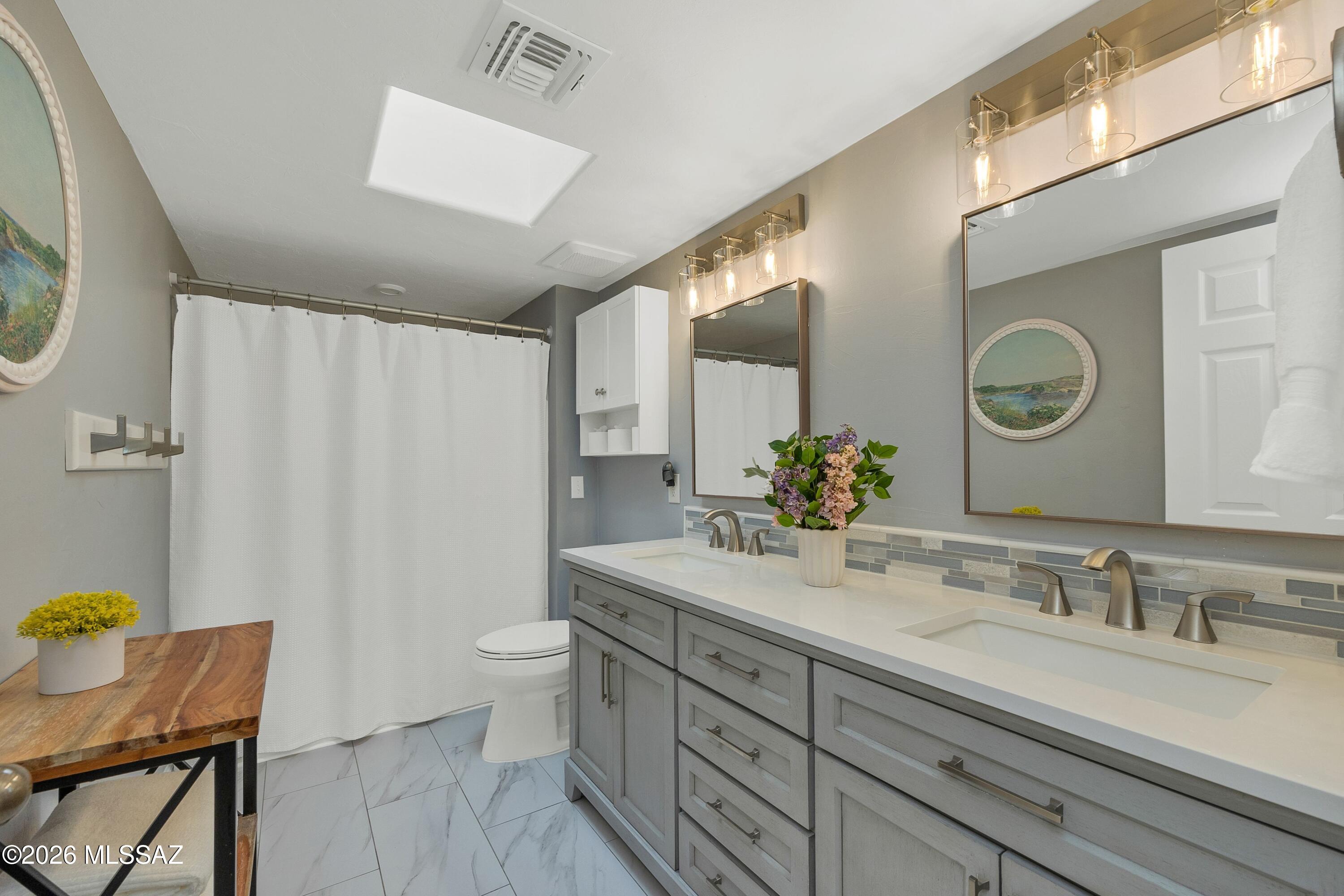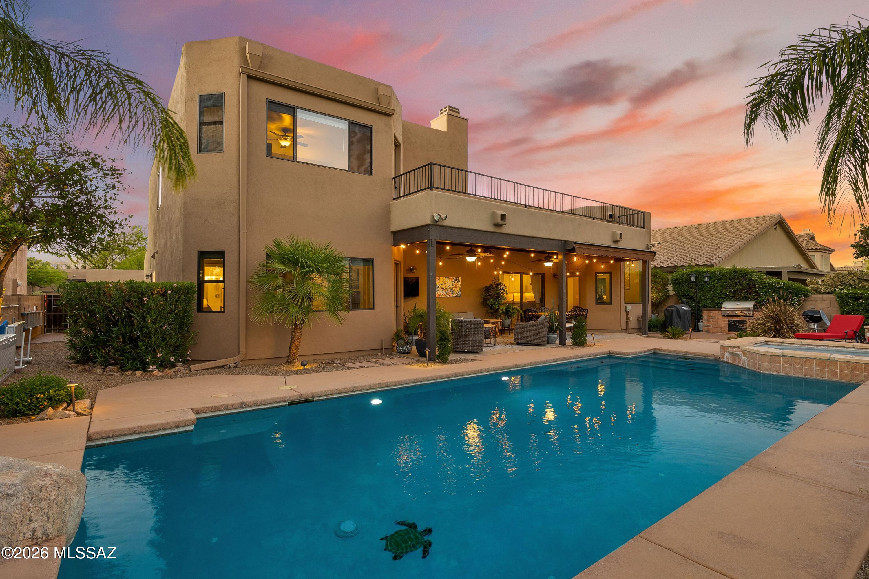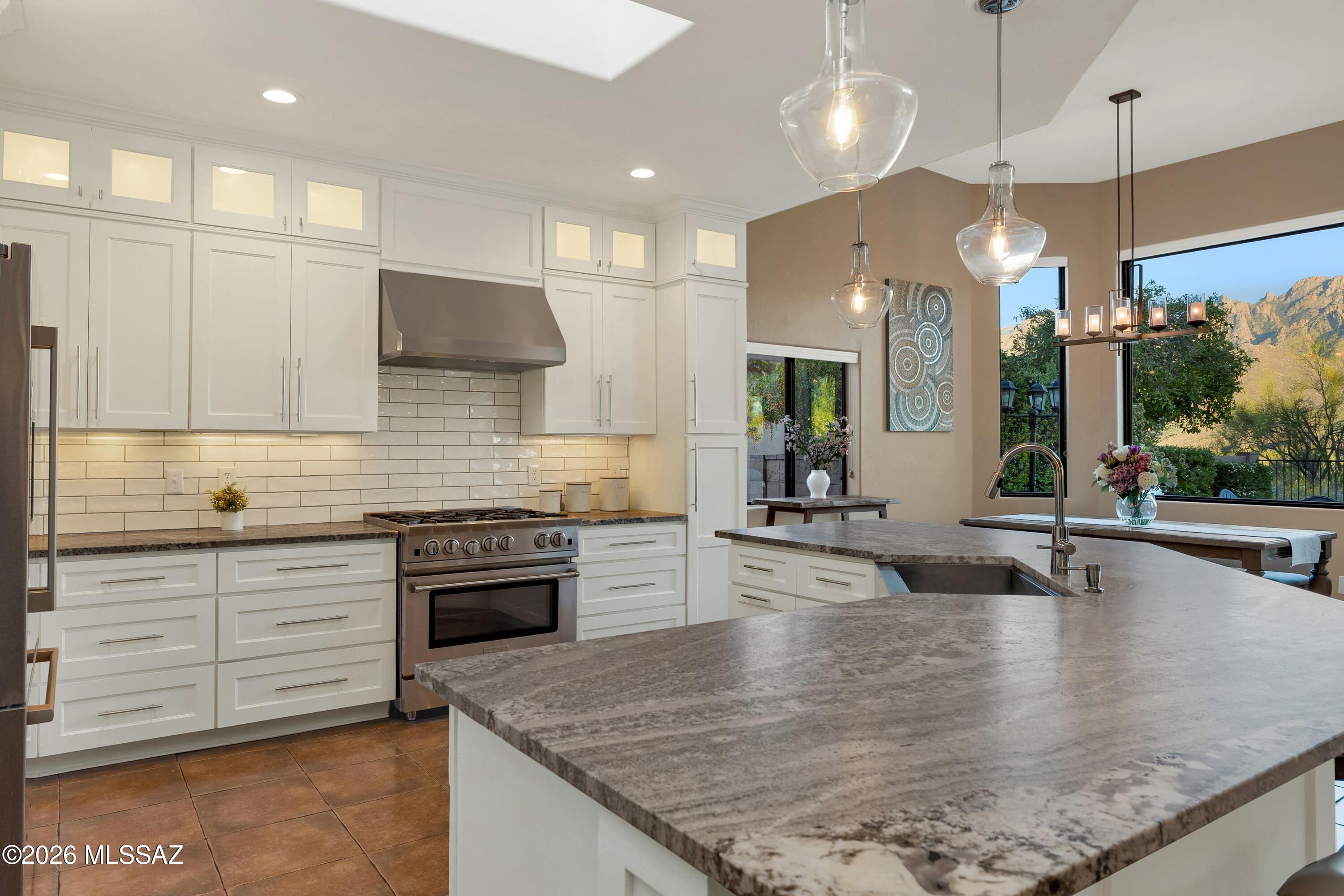 Dramatic views of Pusch Ridge and the Catalina Mountain range await at 1550 E Ganymede Drive. Situated on an elevated SE facing lot in the convenient neighborhood of Catalina Shadows, this property has it all: ample space, outdoor living & gorgeous desert scenery. Iconically Southwest, the Santa Fe style architecture nods to the setting. Inside, a spacious layout with 3,103 sq ft includes 5 bedrooms (main level primary), 2 1/2 bathrooms with dual living spaces - you will find fresh paint throughout. High ceilings & large windows create a sense of openness. Fully renovated, the chef's kitchen is the heart of the home. Outfitted with floor to ceiling custom cabinetry, stainless appliances-including a BlueStar range, and a generous island finished with satin granite counters and wainscoting. Recently enhanced with a new picture window, the breakfast nook provides a perfect visual path to the beaty outside. The downstairs primary bathroom has been refreshed with new tile, painted cabinetry, lighting and accessories.
