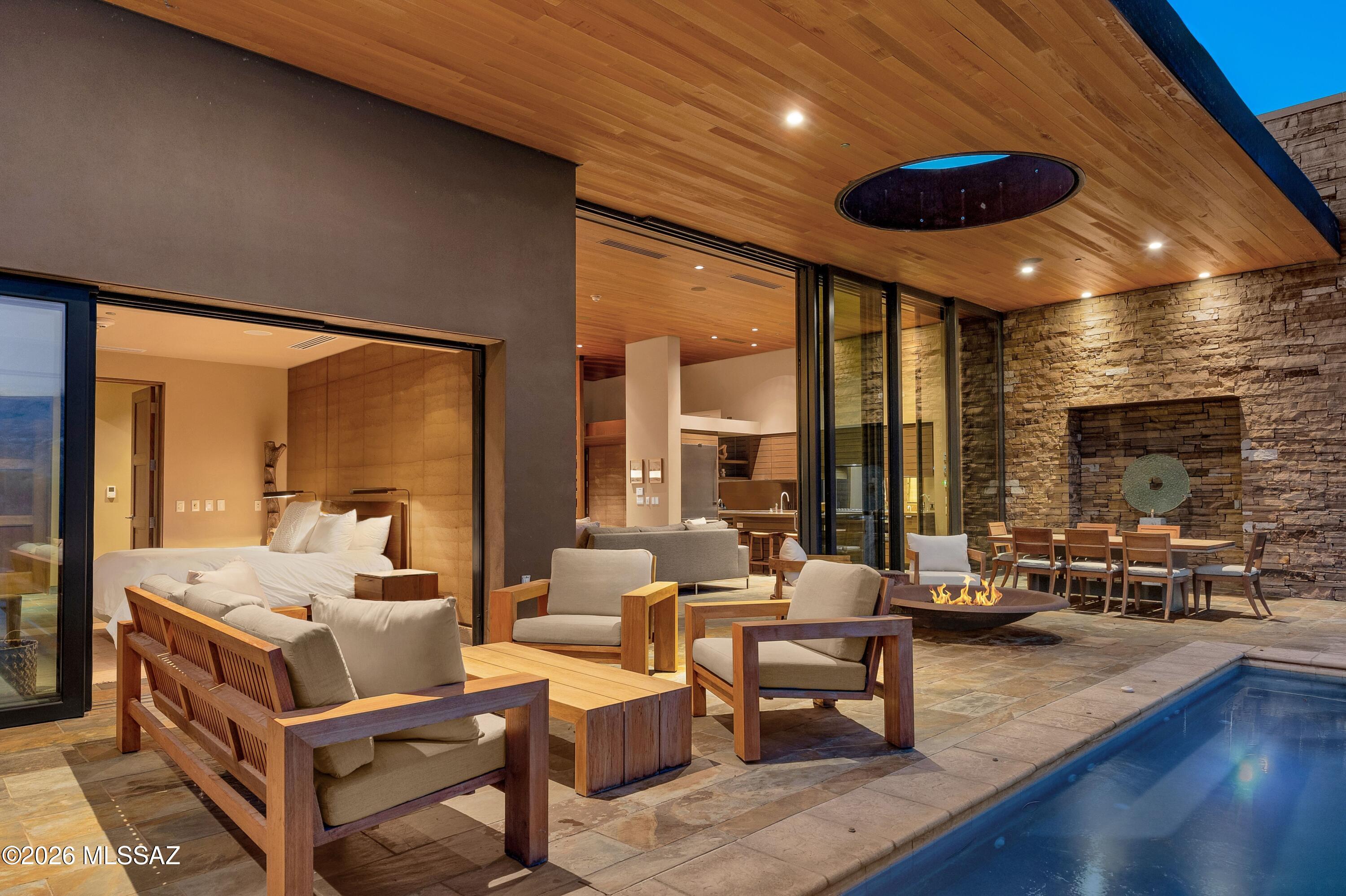 A thoughtful layout offers the ability to comfortably host guests or delineate spaces for different functions. The 2400 sq ft main house includes the primary suite, guest bedroom, guest bath and great room flowing to an expansive patio from which you feel completely secluded. With a gas fire pit, infinity plunge pool with swim jets and outdoor daybed, this area adds substantial living space to the home. A 700 sq ft detached casita provides a private setting for guests with separate living and rest spaces, ensuite bath and courtyard with a jetted spa.