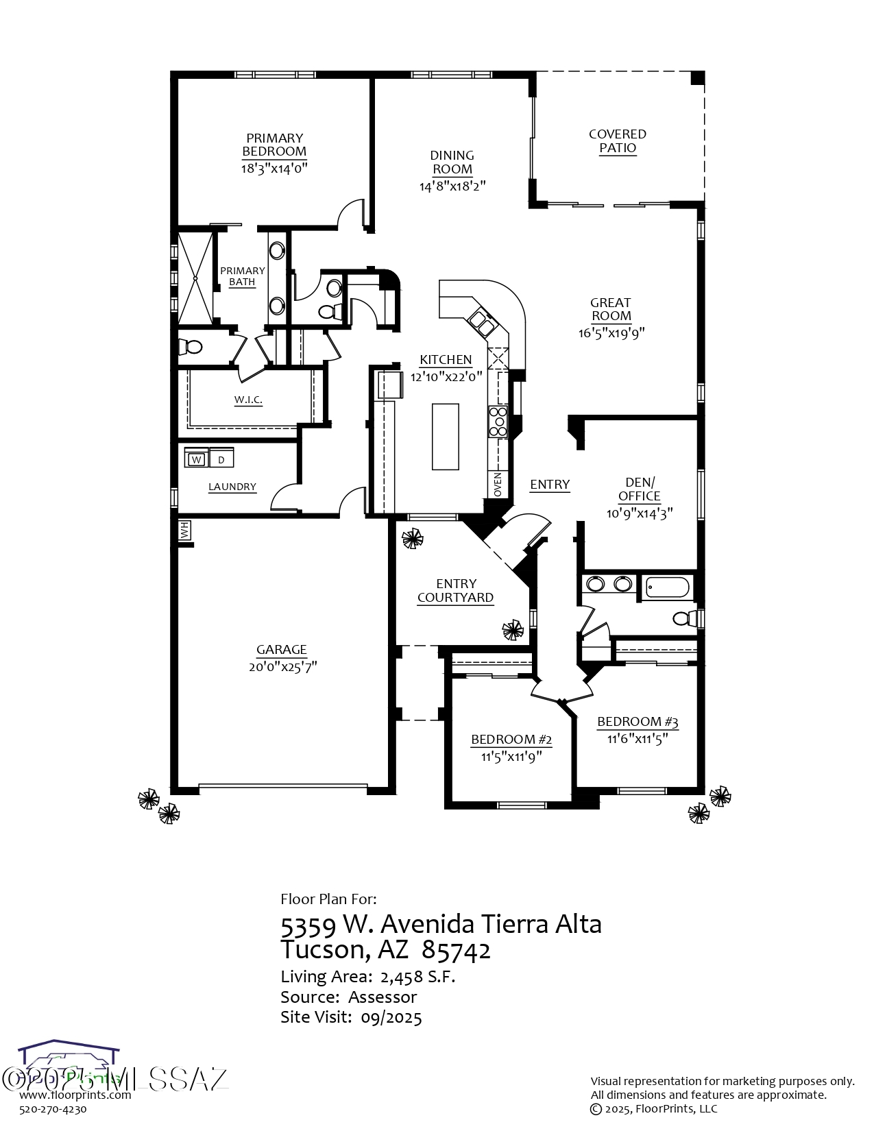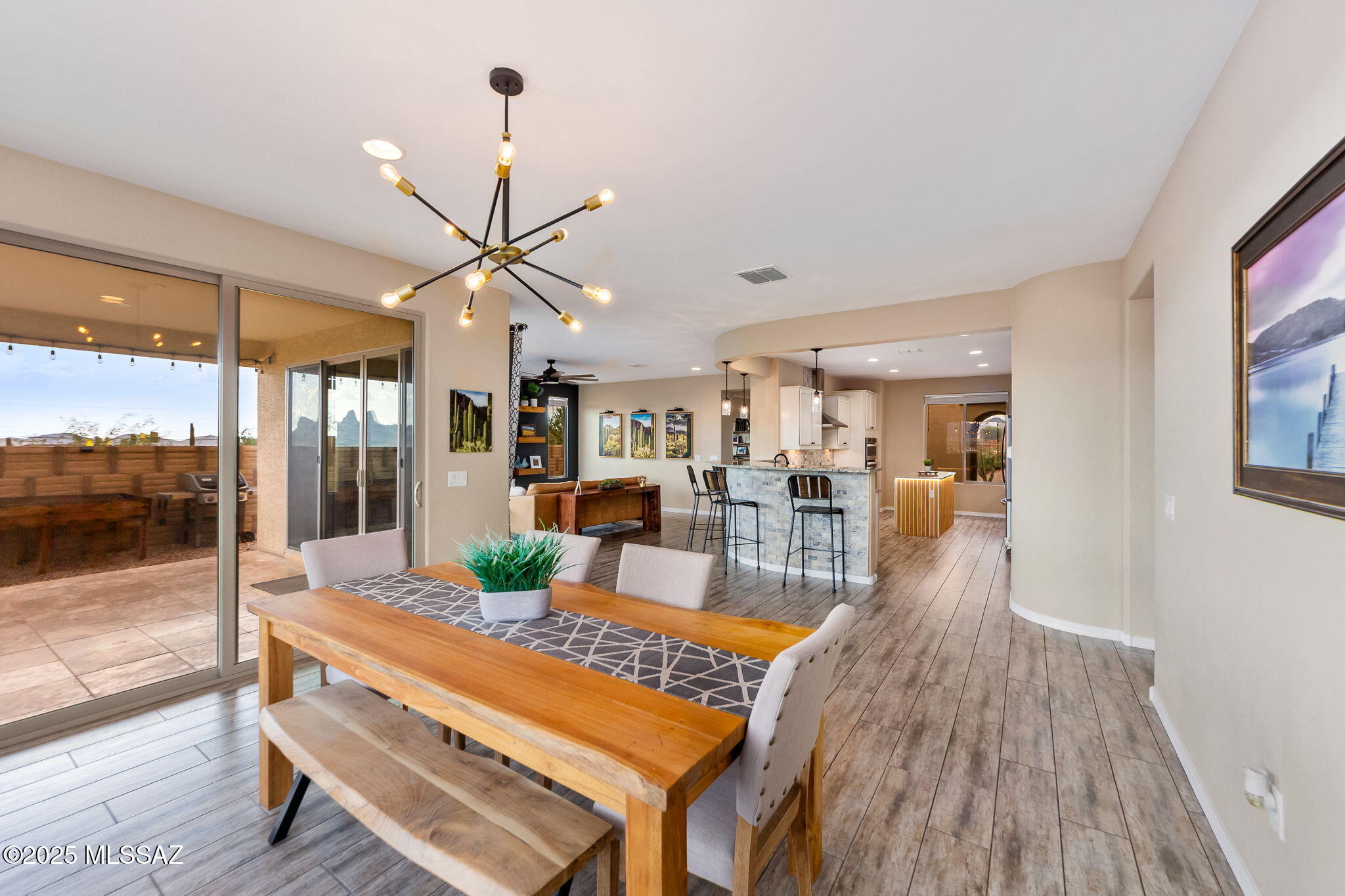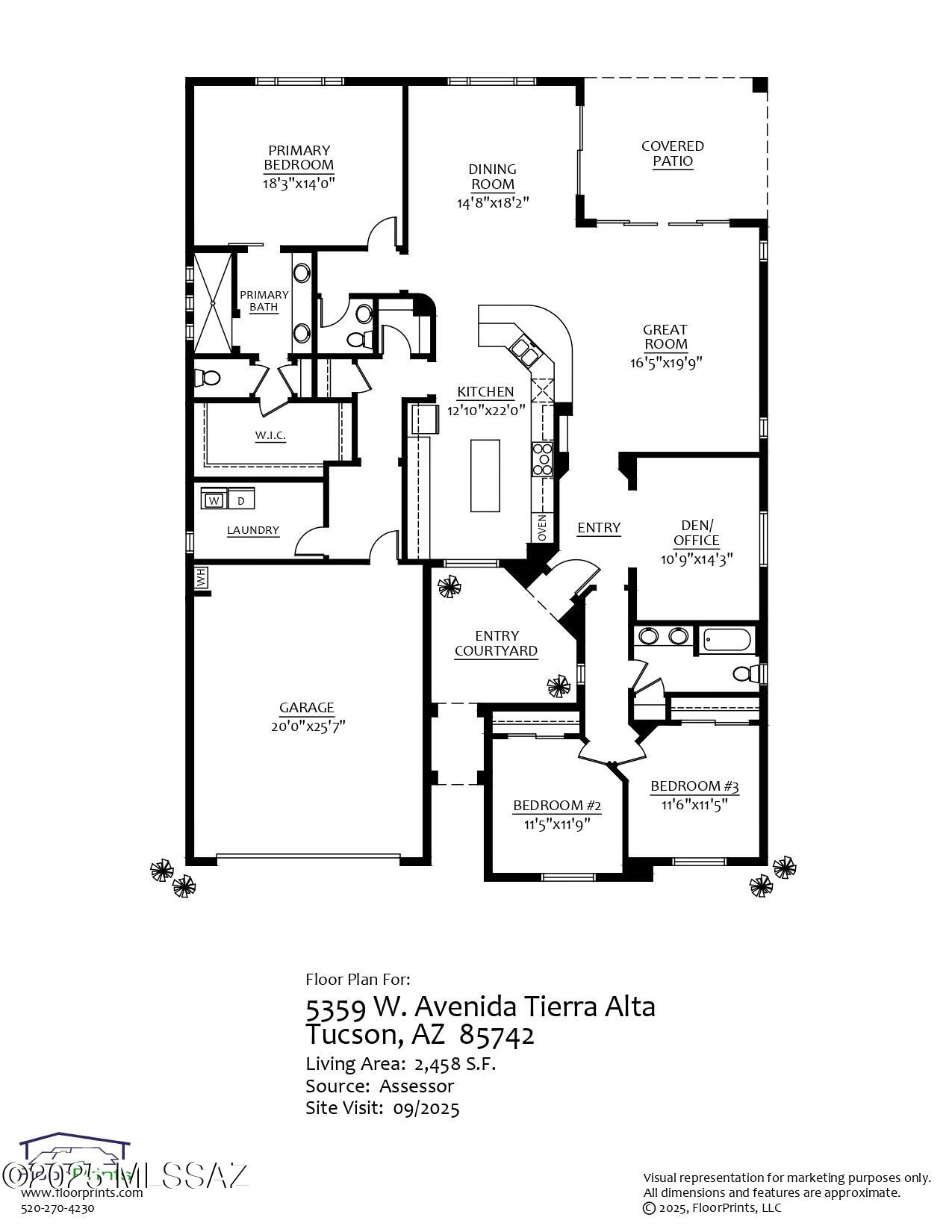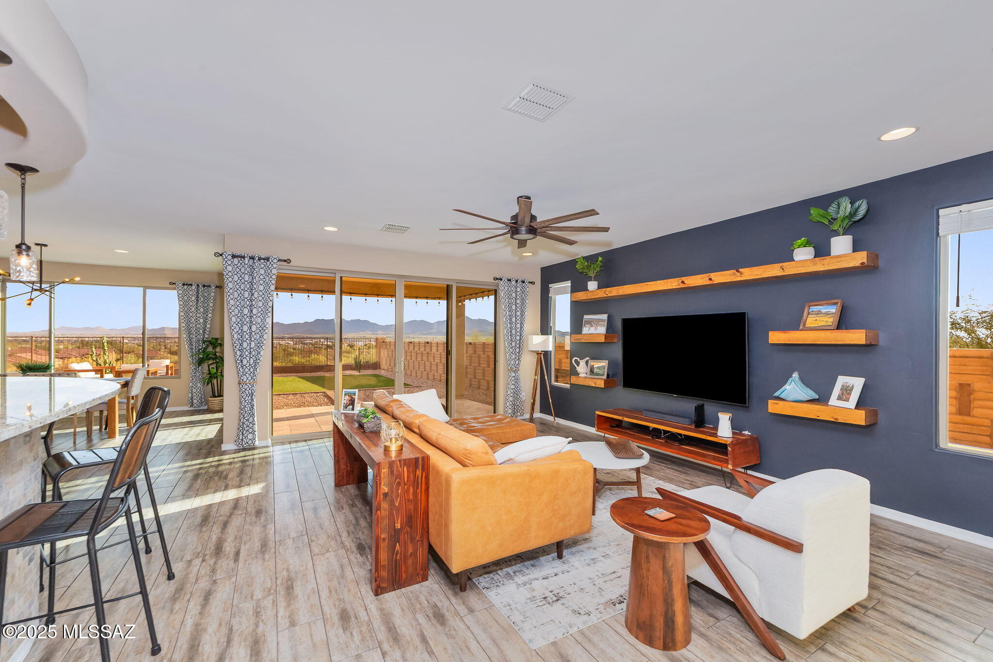 The natural beauty of the desert meets a turn-key residence in an ultra-convenient location at 5359 W Avenida Tierra Alta. Built in 2020, the elevated corner lot abuts open space showcasing incredible views of multiple mountain ranges and colorful Tucson sunsets. This well-appointed home has been meticulously cared for and includes many upgraded features. With 2,458 sq ft on a single story, the split floor plan provides 3 bedrooms, 2 1/2 bathrooms, a separate den. Throughout, the quality of the fit and finish is noticeable--plank tile floors, highly upgraded cabinetry, stone accents, granite countertops and custom woodwork. The kitchen is a chef's delight featuring abundant counter space, loads of cabinetry, stainless appliances, an undermount sink, and a walk-in pantry. Sliding glass doors from both the great room and dining area create effortless flow to the covered patio finished with travertine tile. Low maintenance, but high impact, the backyard provides the perfect vantage point to enjoy the surrounding beauty. A gas line is available and ready to install a grill, and ample space is available should a pool be desired in the future.