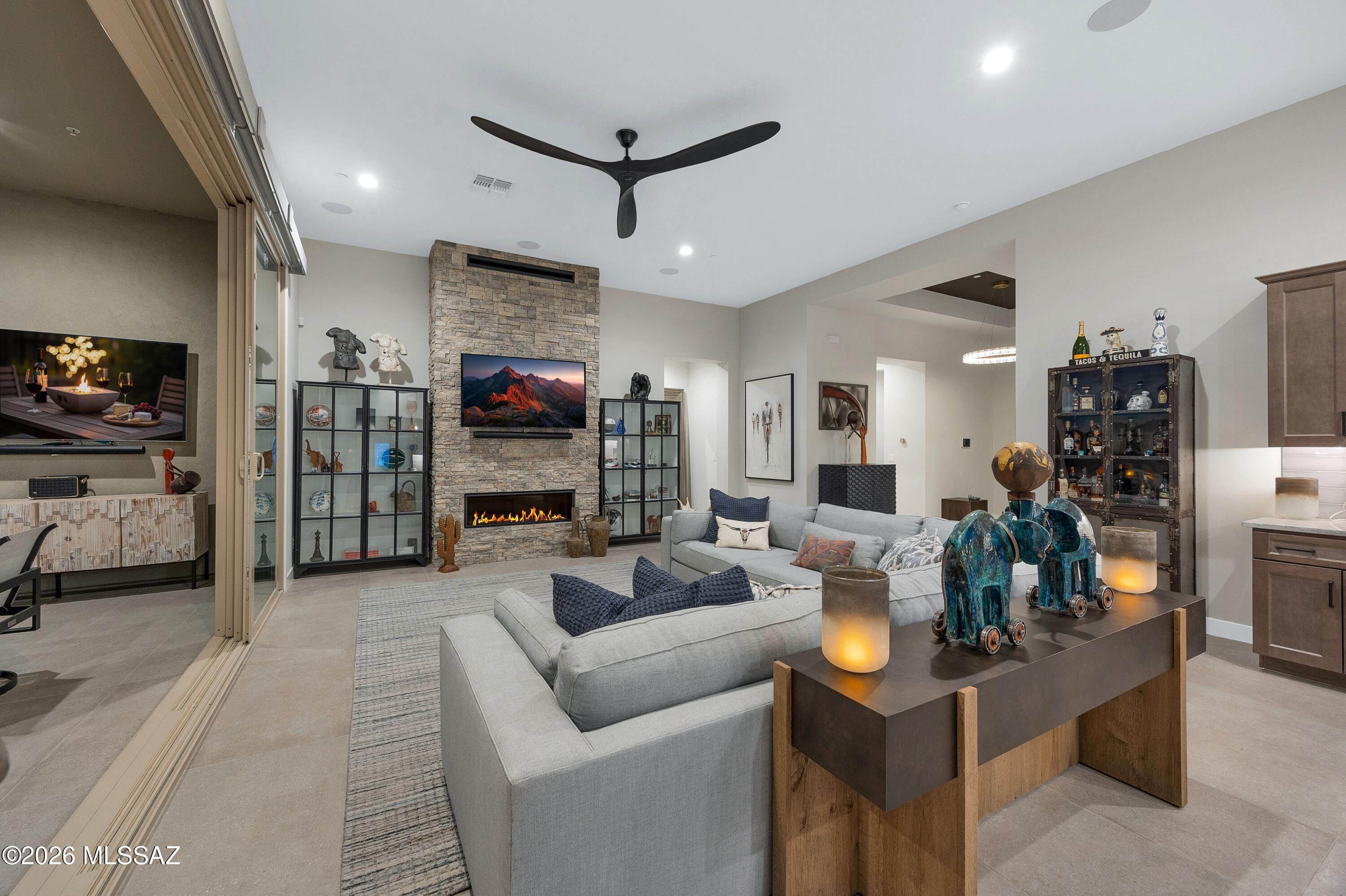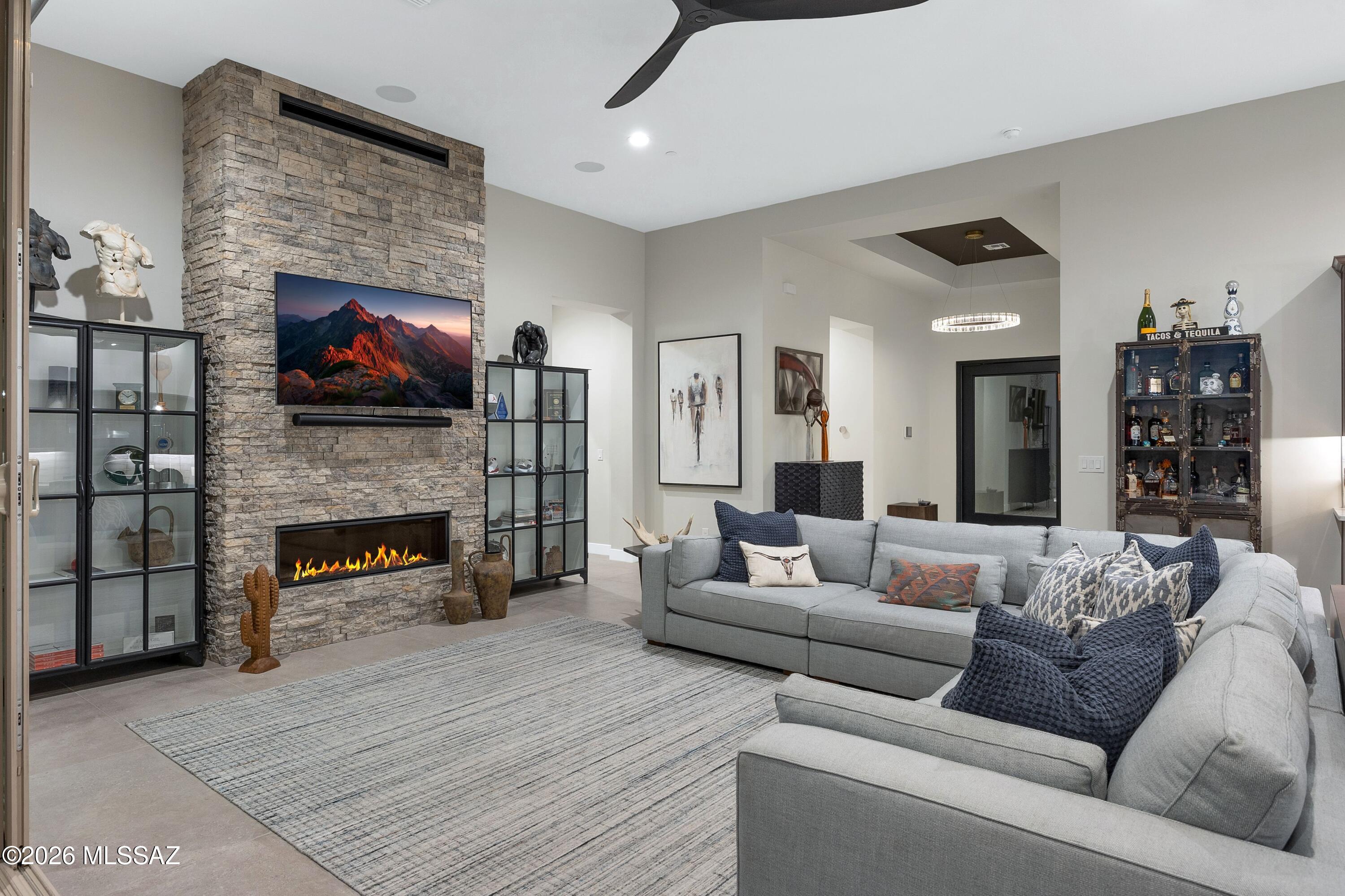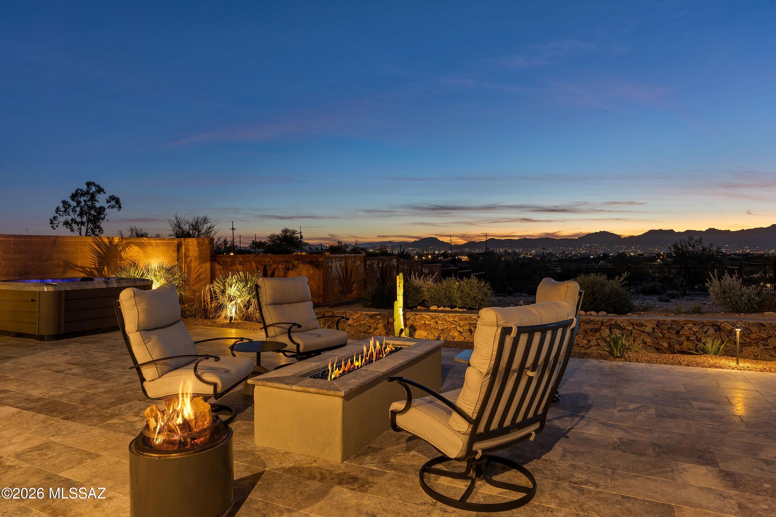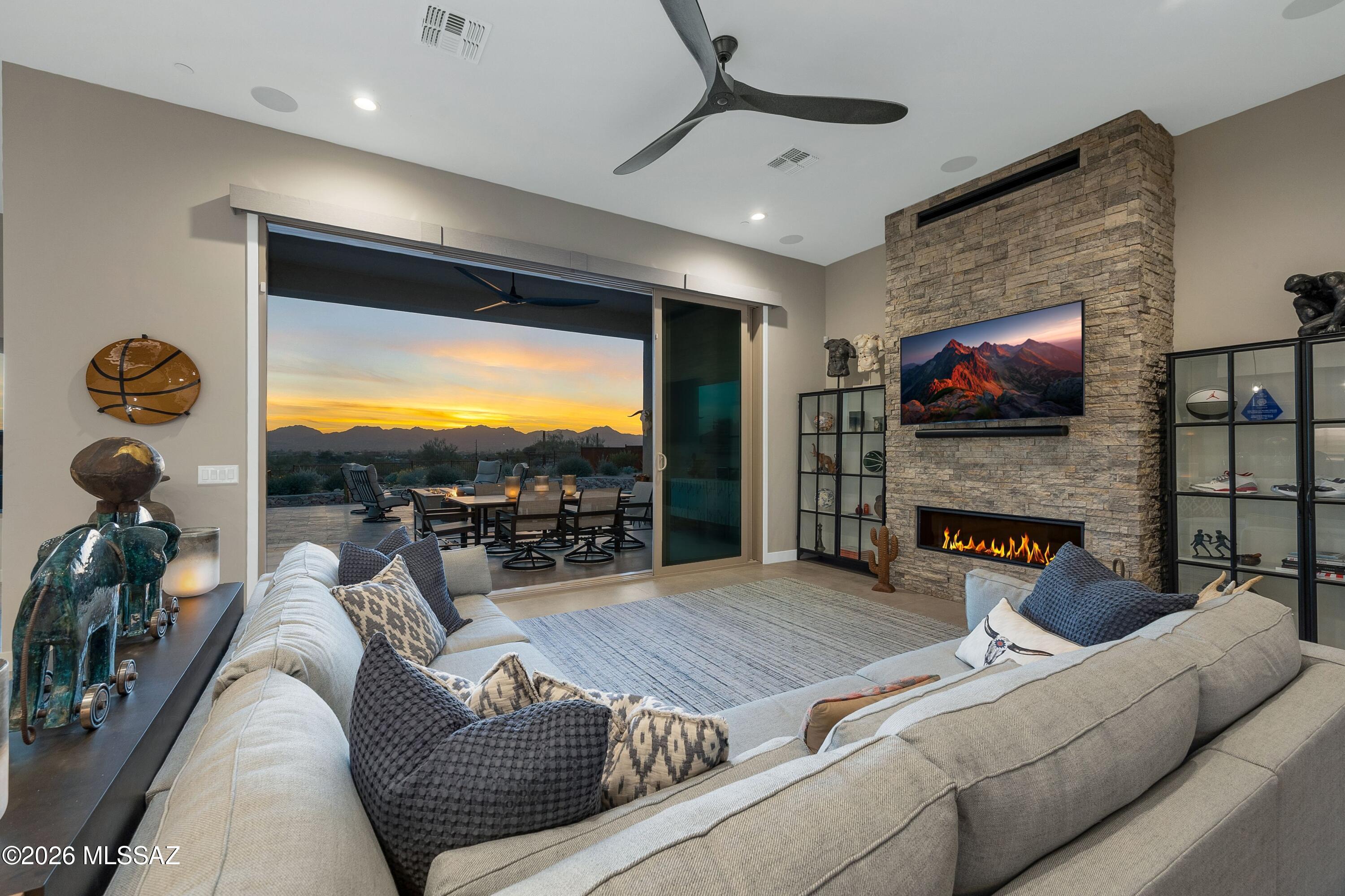 The great room seamlessly opens to the outdoor living area, which is truly magnificent. Everything to maximize desert life has been completed--the pool with a built-in fountain, silver travertine decking, gas firepit, synthetic grass area and the custom artistic metal panels. Extended fencing has created a huge yard, maximizing the views and offering unlimited potential.