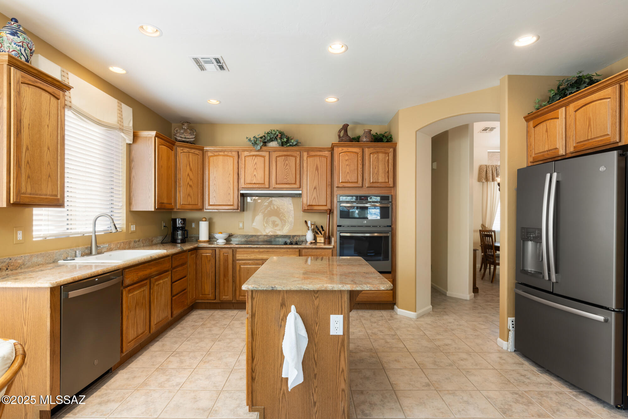 The Arizona lifestyle awaits at this well cared for home in Saddlebrooke. Sitting on a North facing lot that backs up to open space, there is excellent privacy and lovely desert flora & critters to enjoy. This functional layout (the Dakota) includes a 3-car garage and 2,428 sq ft of living space with 3 bedrooms, 2 bathrooms and 2 living spaces. Vaulted ceilings are found throughout, providing a light, airy quality, as well as large windows providing visual pathways to the greenery outside. Recently, the kitchen appliances have been updated, as well as the HVAC system. In Saddlebrooke, residents enjoy a neighborhood robust with opportunities to live life to its fullest. From this home, it's a quick walk or golf cart ride to the Mountainview Golf Club & Sports Complex, which includes 18 holes with stunning scenery, tennis & pickleball courts, 2 pools (including lap lanes), and a fitness center. In the same complex, there is also dining and a performing arts center offering a variety of shows and music. Beyond the amenities, there are more than 100 activities, clubs and classes available.