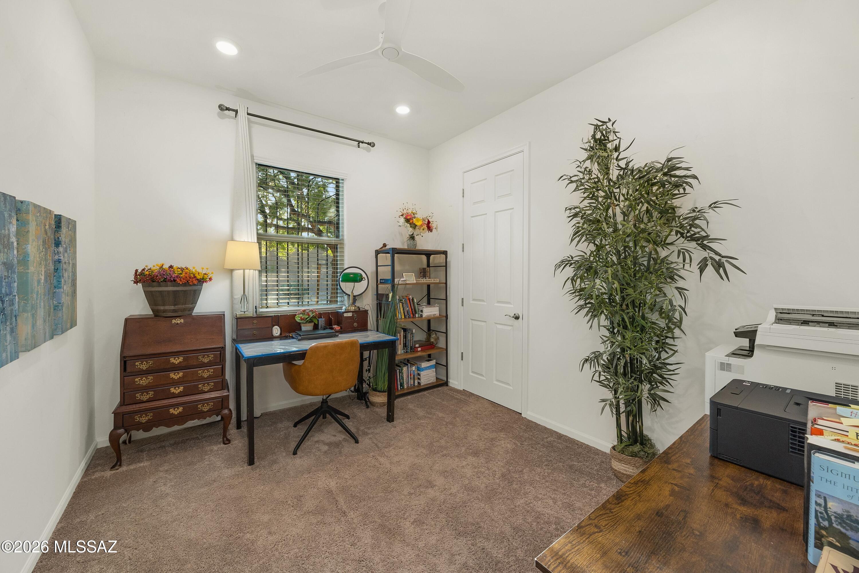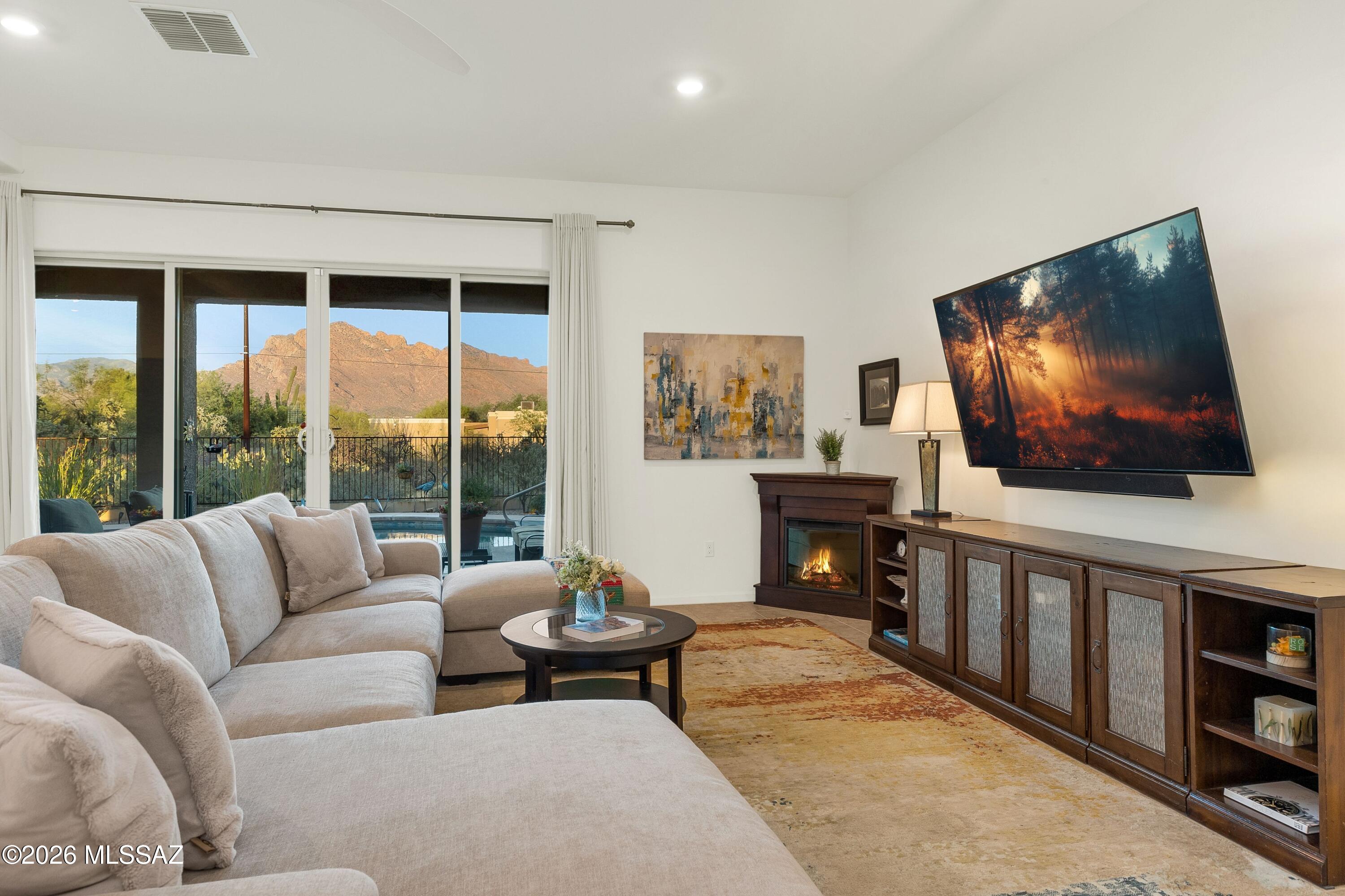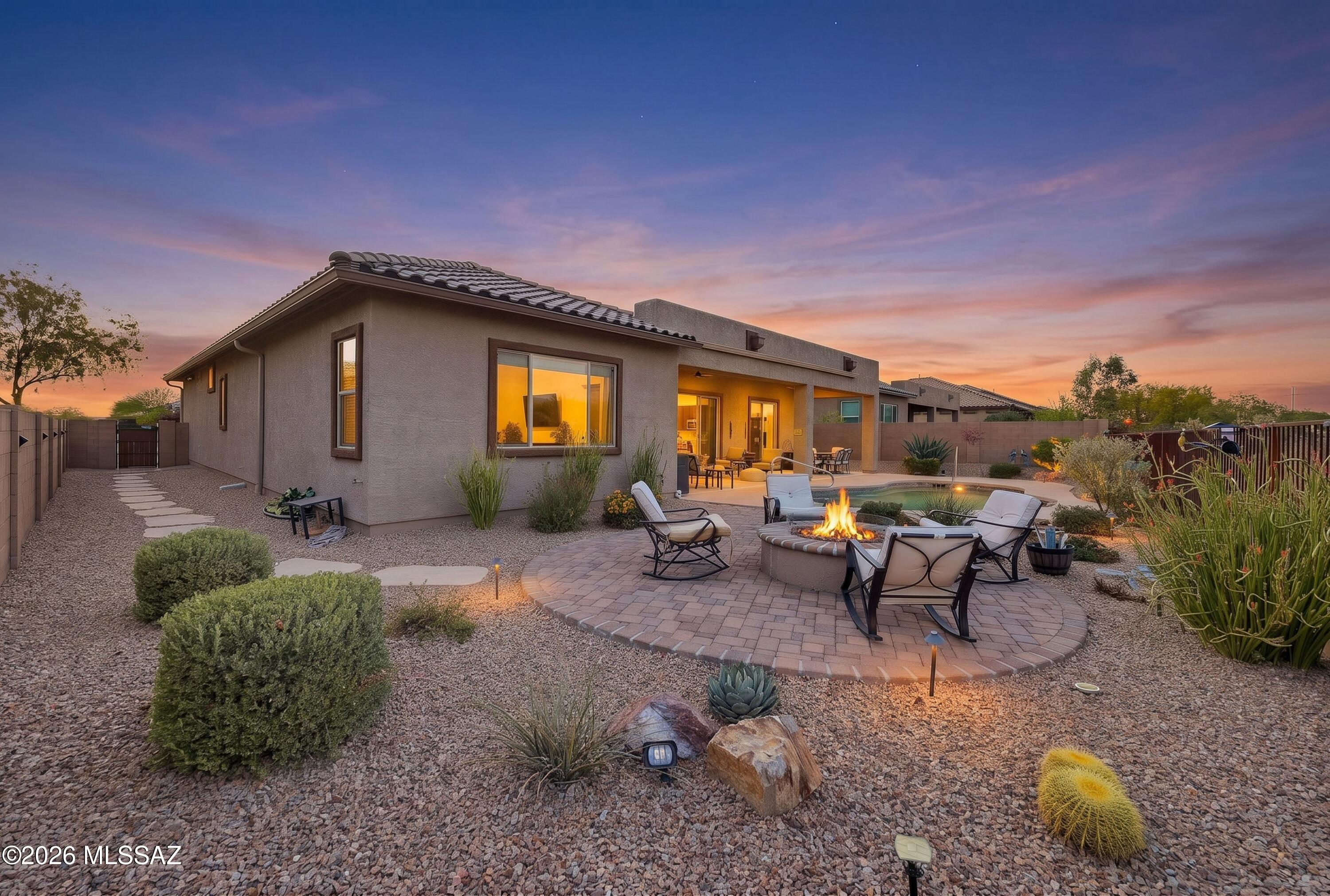 Outdoors, the backyard has been beautifully finished with a heated swimming pool, pavers, a gas firepit and desert plantings to attract birds. The eastern exposure welcomes morning light and allows for shade in the afternoon. Changing color throughout the day, the mountains provide a perfect backdrop.