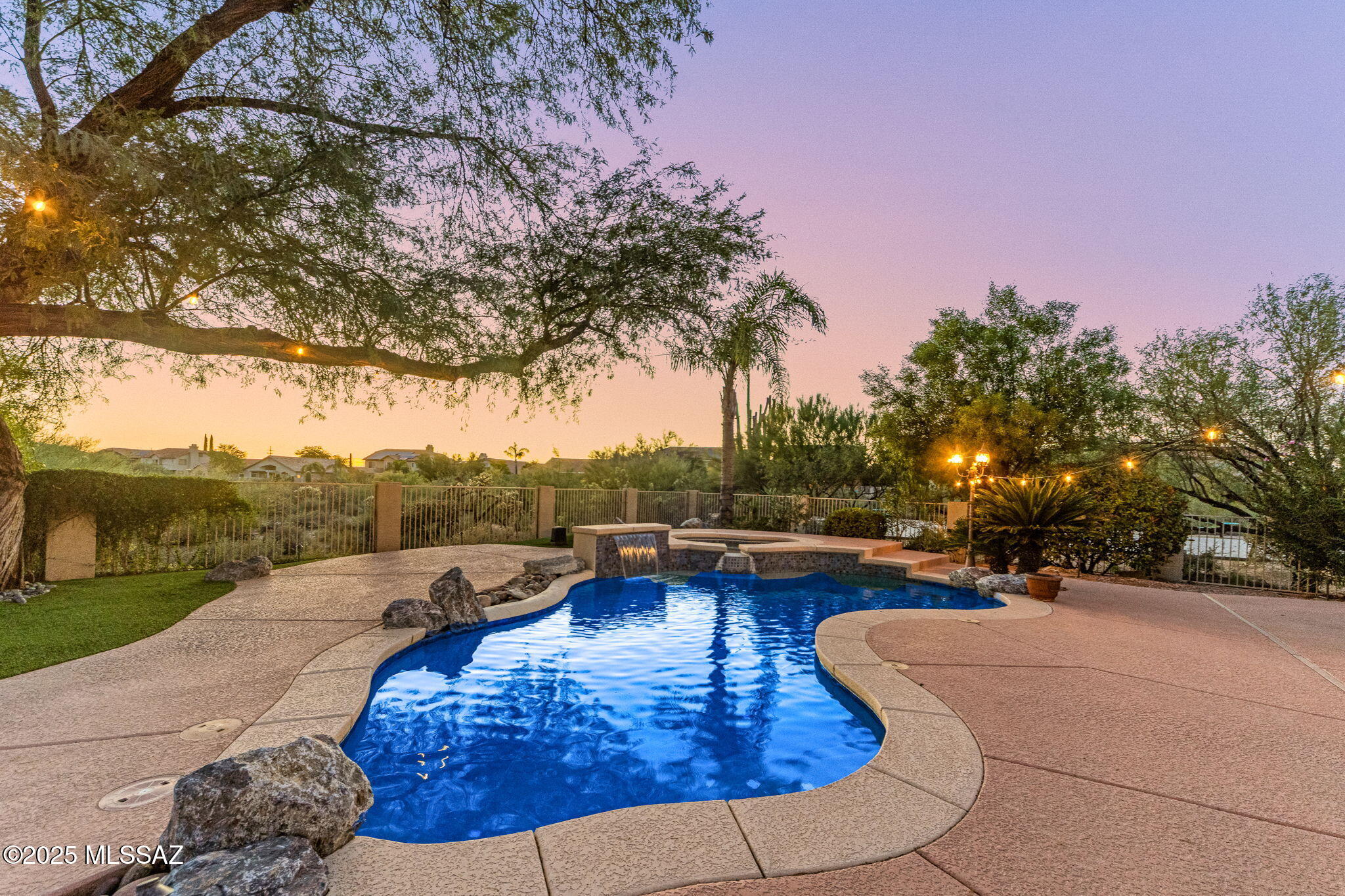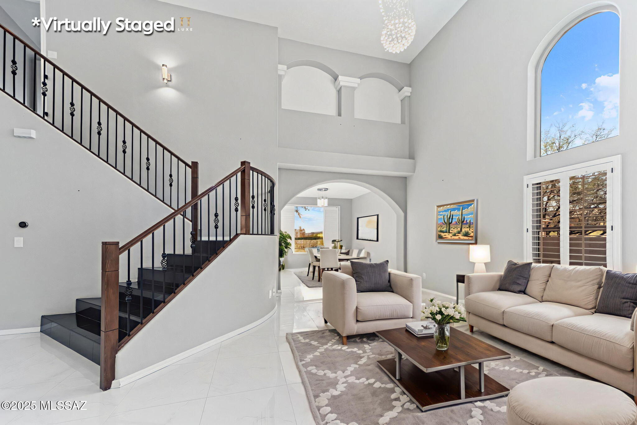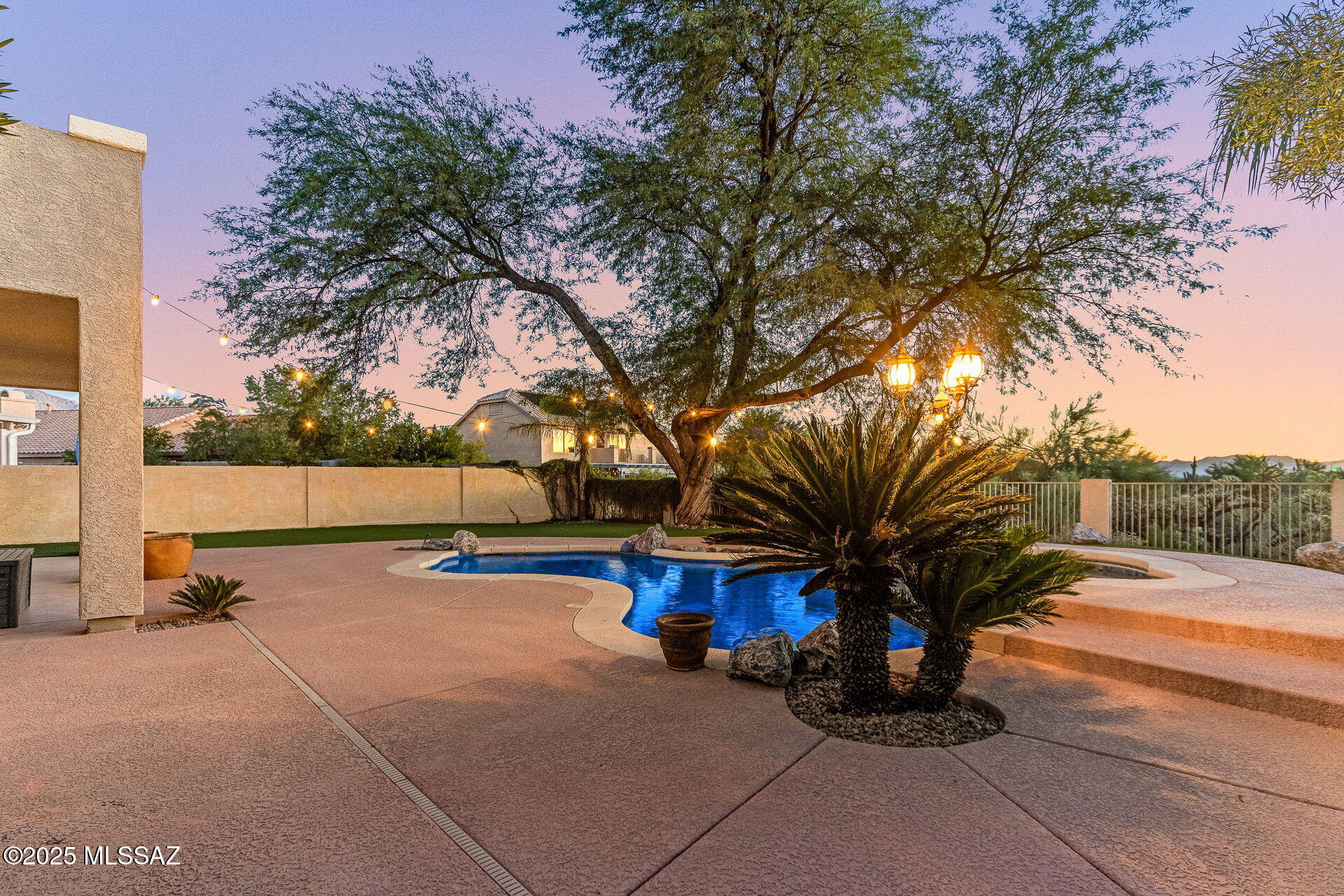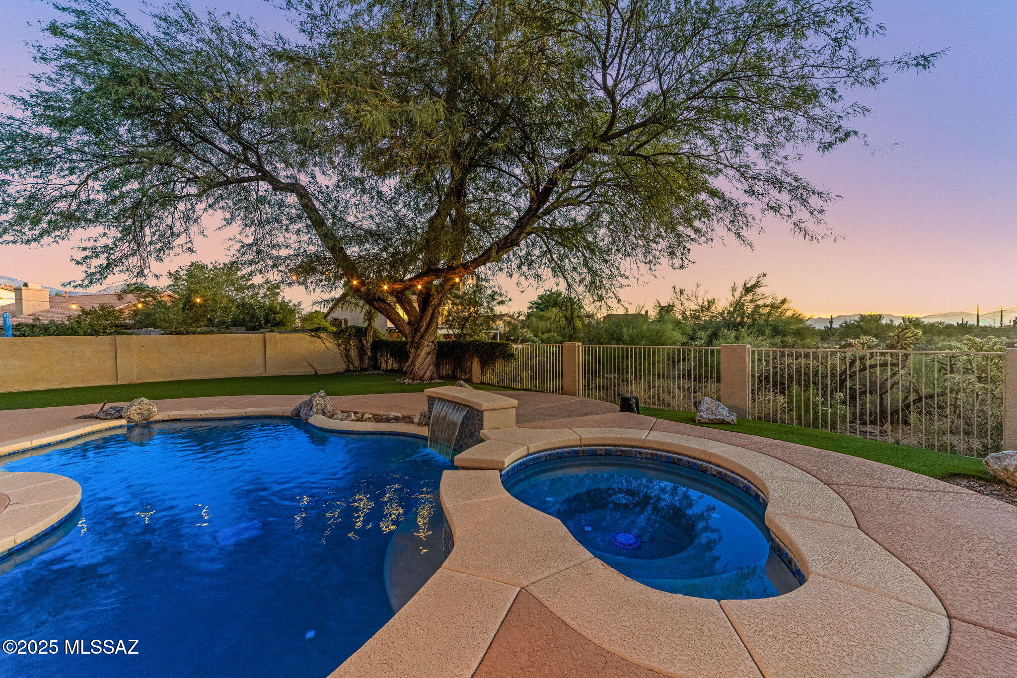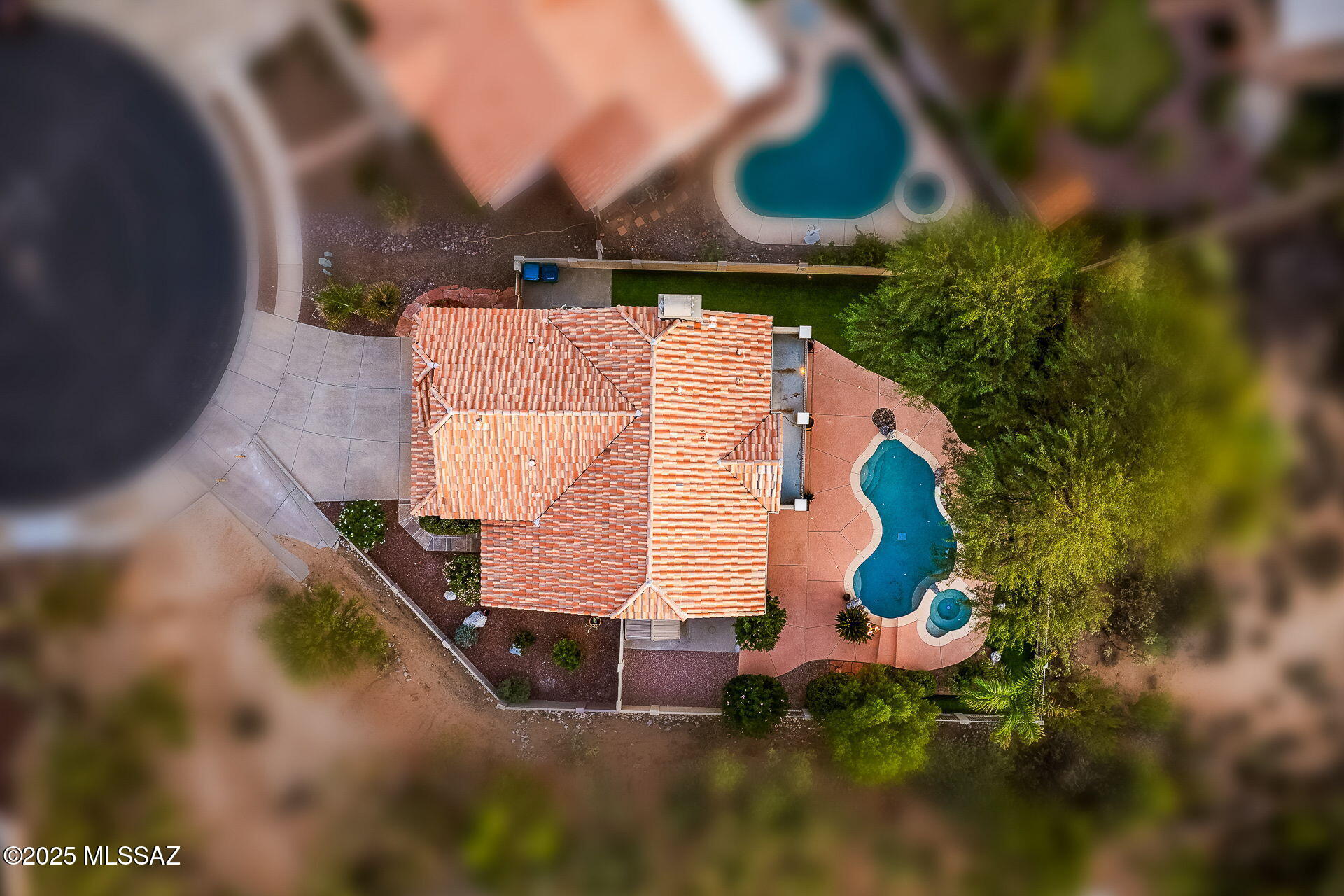 Tucked away on an end lot in a cul de sac with the convenience and amenities of Oro Valley at your fingertips - welcome to 2025 W Golden Rose Place. With open space behind and a magnificent backyard, outdoor living is at the forefront of this residential experience. Layer in the enjoyment of a quiet park next door that functions like an extension of this lot. Recently renovated, the property features 3 bedrooms, 2 1/2 baths, plus a den, spread over 2,451 sq ft. Oversized windows create light filled spaces, complemented by a clean and contemporary palette. A few of the upgraded features include large format porcelain tiles, luxury lighting, and a custom primary closet. Enjoy seeing greenery out the windows and Catalina Mountain views from the upper deck off the primary suite. The backyard is a desert sanctuary with excellent privacy and amenities. With a large swimming pool, in ground spa, expansive turf area, and plenty of areas for seating, there are many ways to enjoy the space. With no rear neighbors, open views to the green space behind showcase colorful sunsets.