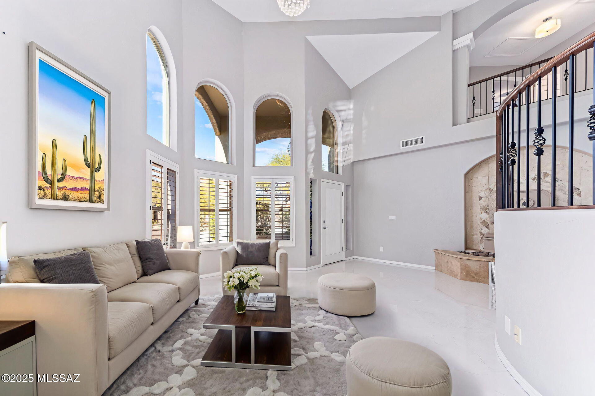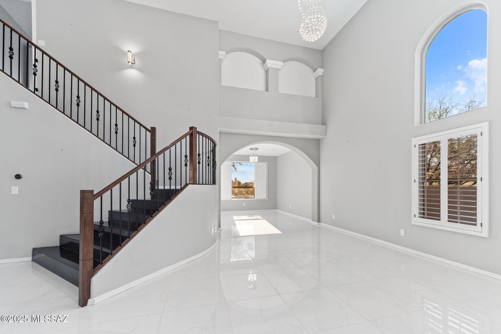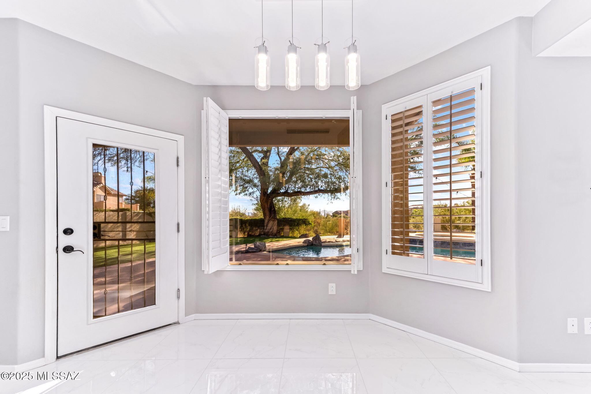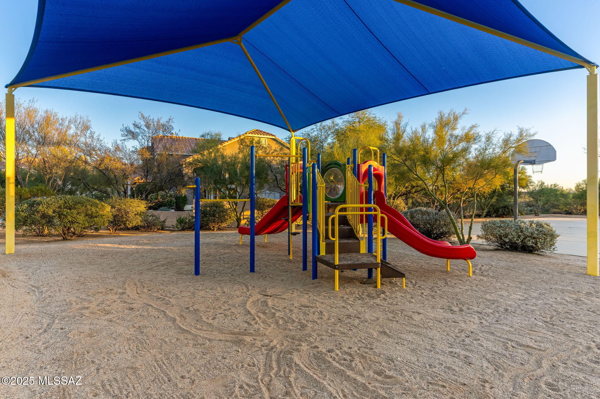 Tucked away on an end lot in a cul de sac with the convenience and amenities of Oro Valley at your fingertips - welcome to 2025 W Golden Rose Place. With open space behind and a magnificent backyard, outdoor living is at the forefront of this residential experience. Layer in the enjoyment of a quiet park next door that functions like an extension of this lot. Recently renovated, the property features 3 bedrooms, 2 1/2 baths, plus a den, spread over 2,451 sq ft. Oversized windows create light filled spaces, complemented by a clean and contemporary palette. A few of the upgraded features include large format porcelain tiles, luxury lighting, and a custom primary closet. Enjoy seeing greenery out the windows and Catalina Mountain views from the upper deck off the primary suite. The backyard is a desert sanctuary with excellent privacy and amenities. With a large swimming pool, in ground spa, expansive turf area, and plenty of areas for seating, there are many ways to enjoy the space. With no rear neighbors, open views to the green space behind showcase colorful sunsets.