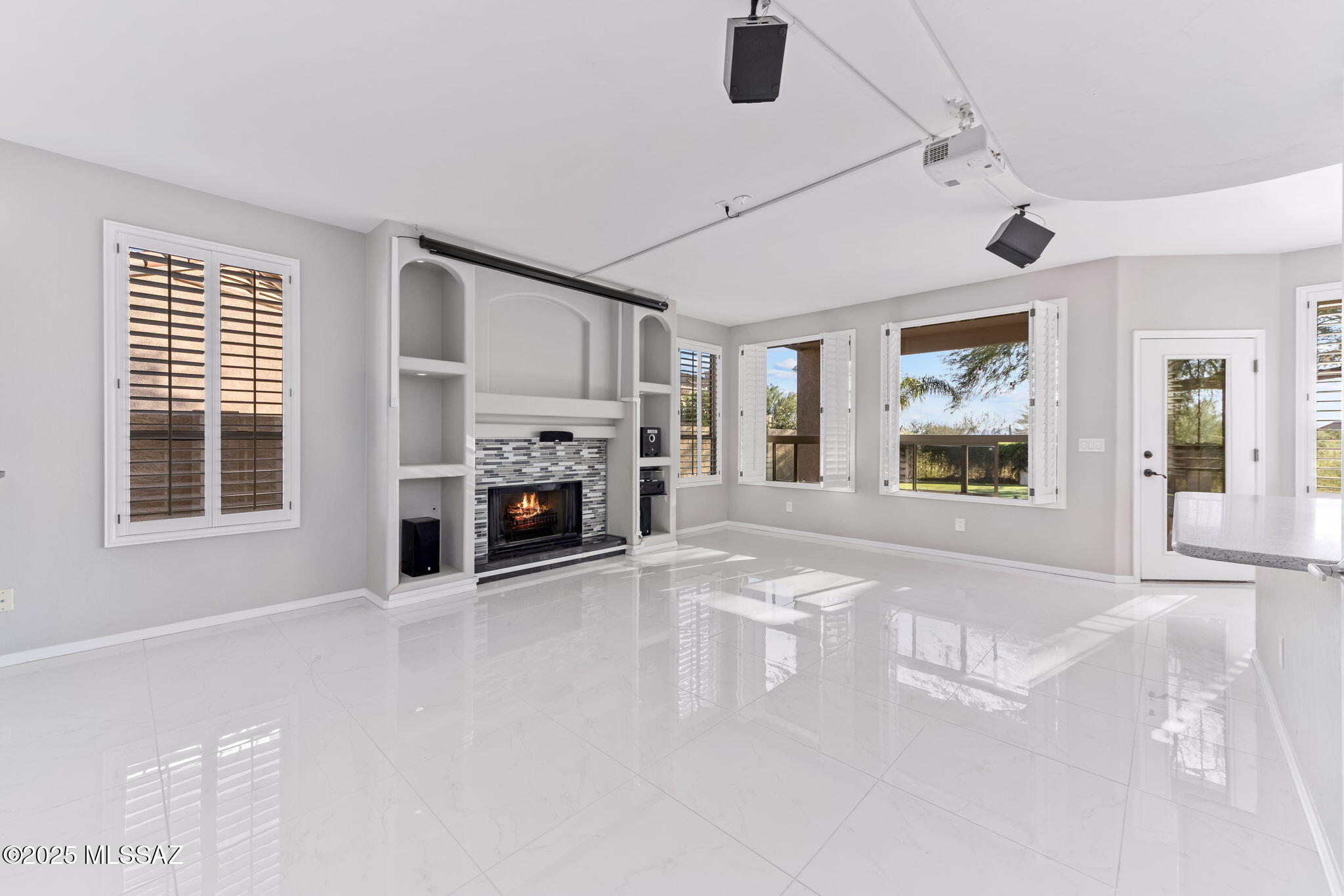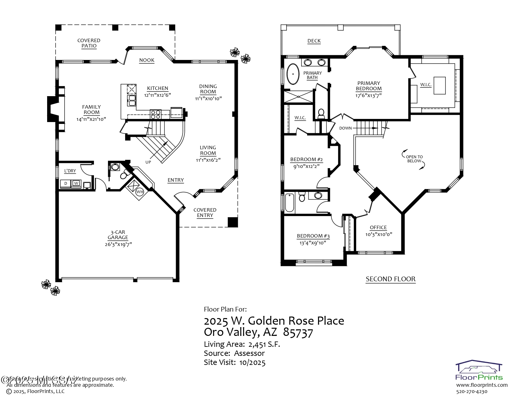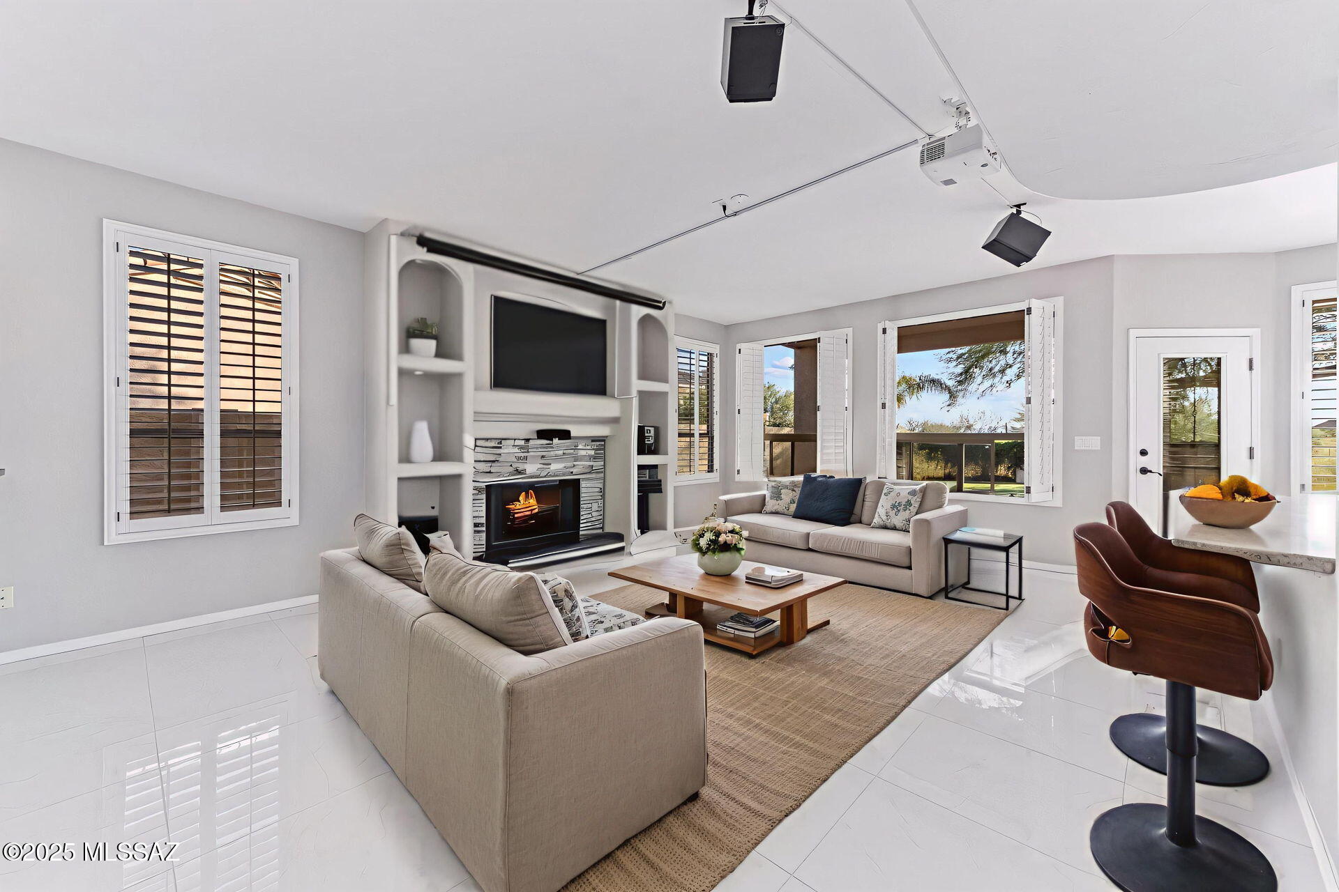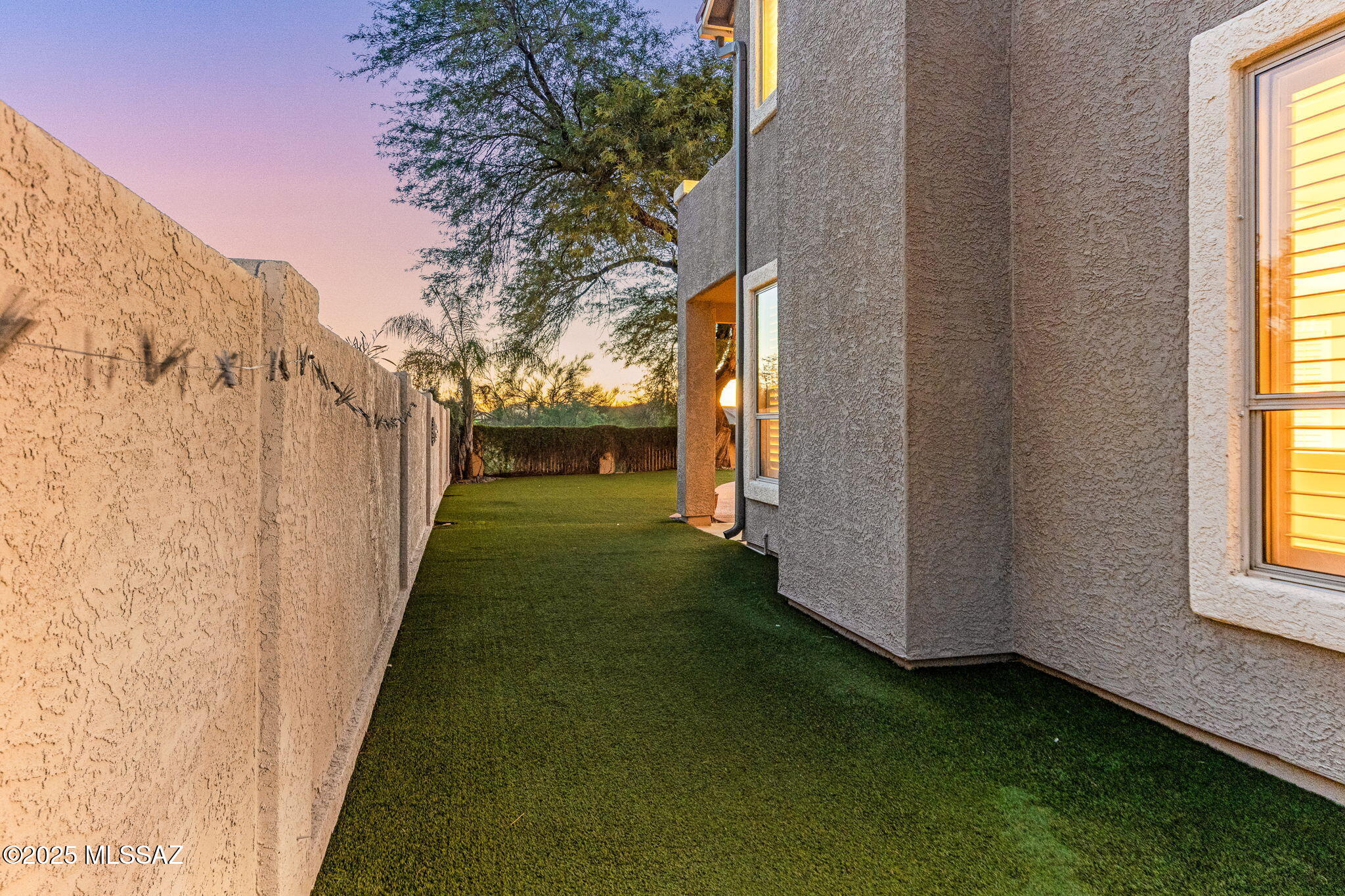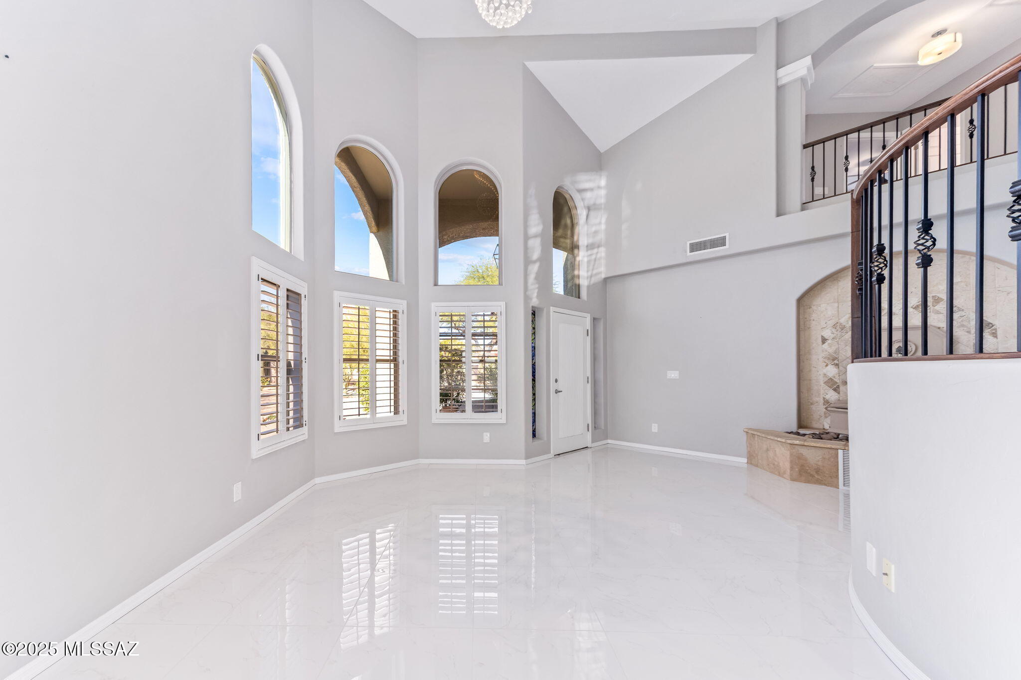 Tucked away on an end lot in a cul de sac with the convenience and amenities of Oro Valley at your fingertips - welcome to 2025 W Golden Rose Place. With open space behind and a magnificent backyard, outdoor living is at the forefront of this residential experience. Layer in the enjoyment of a quiet park next door that functions like an extension of this lot. Recently renovated, the property features 3 bedrooms, 2 1/2 baths, plus a den, spread over 2,451 sq ft. Oversized windows create light filled spaces, complemented by a clean and contemporary palette. A few of the upgraded features include large format porcelain tiles, luxury lighting, and a custom primary closet. Enjoy seeing greenery out the windows and Catalina Mountain views from the upper deck off the primary suite. The backyard is a desert sanctuary with excellent privacy and amenities. With a large swimming pool, in ground spa, expansive turf area, and plenty of areas for seating, there are many ways to enjoy the space. With no rear neighbors, open views to the green space behind showcase colorful sunsets.