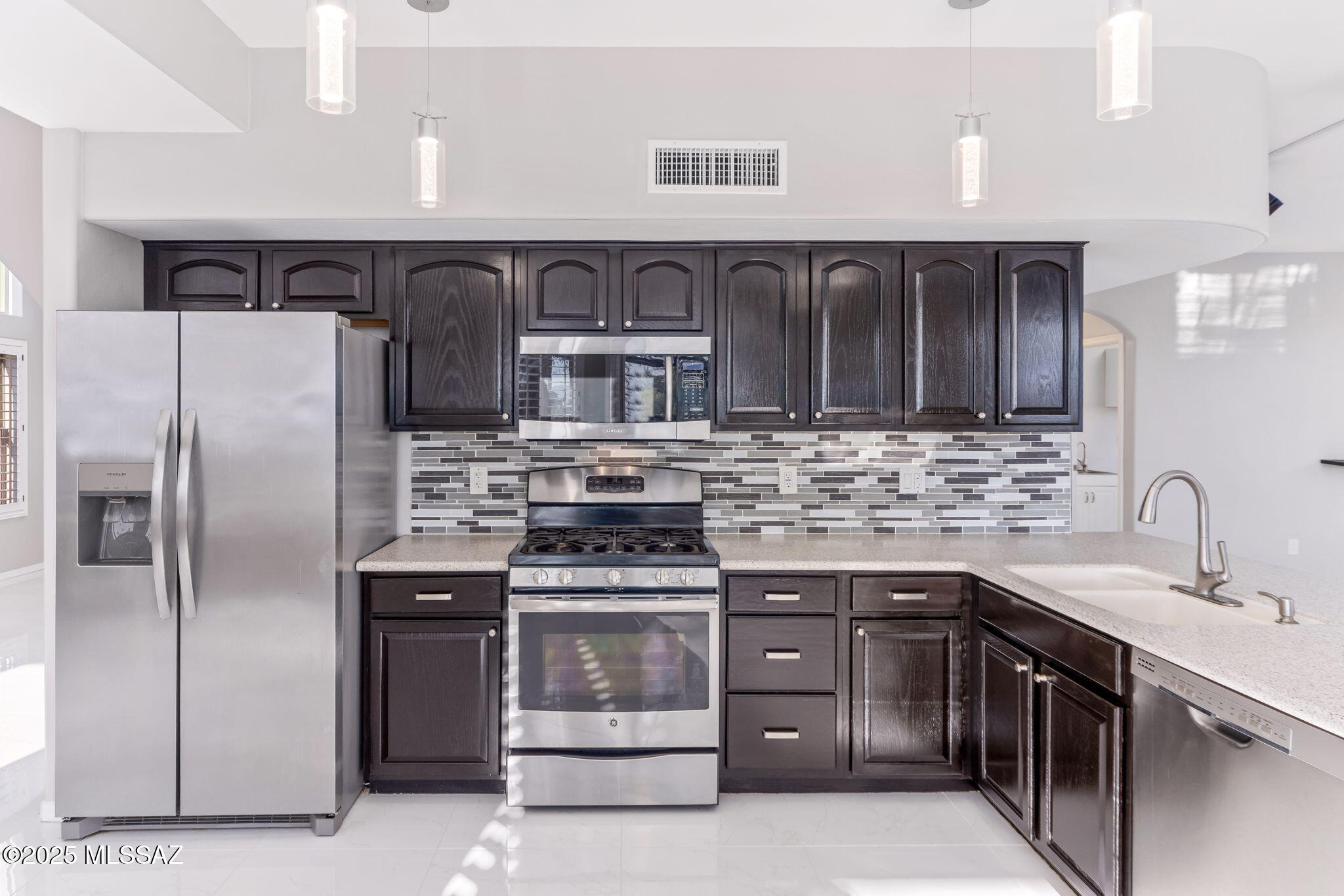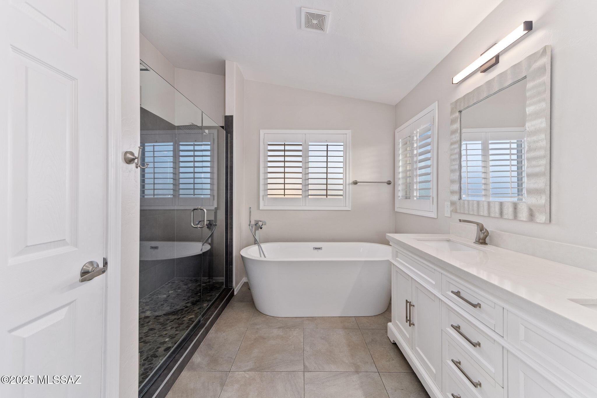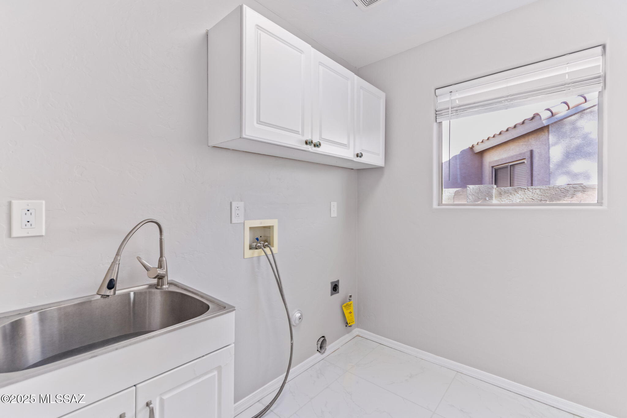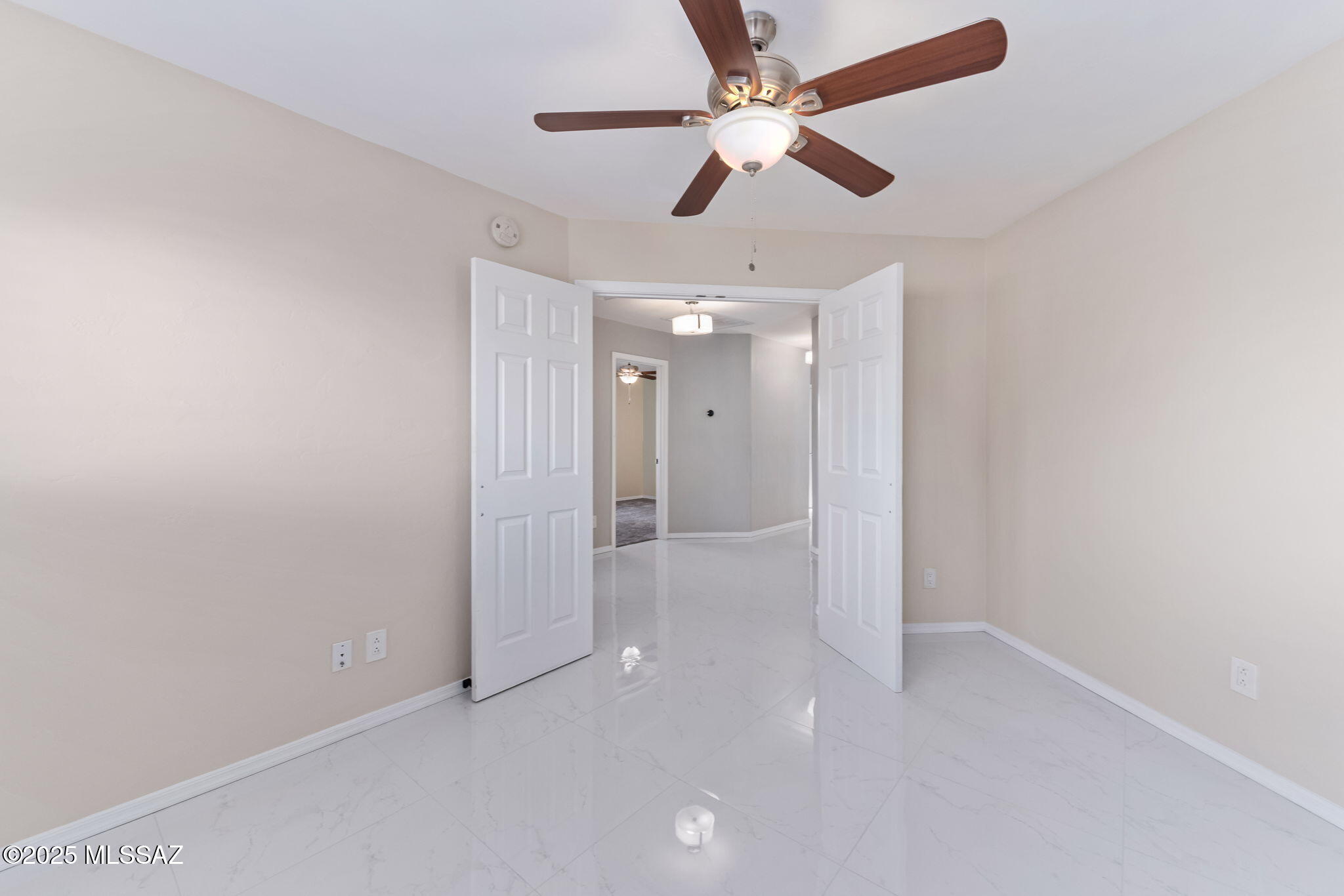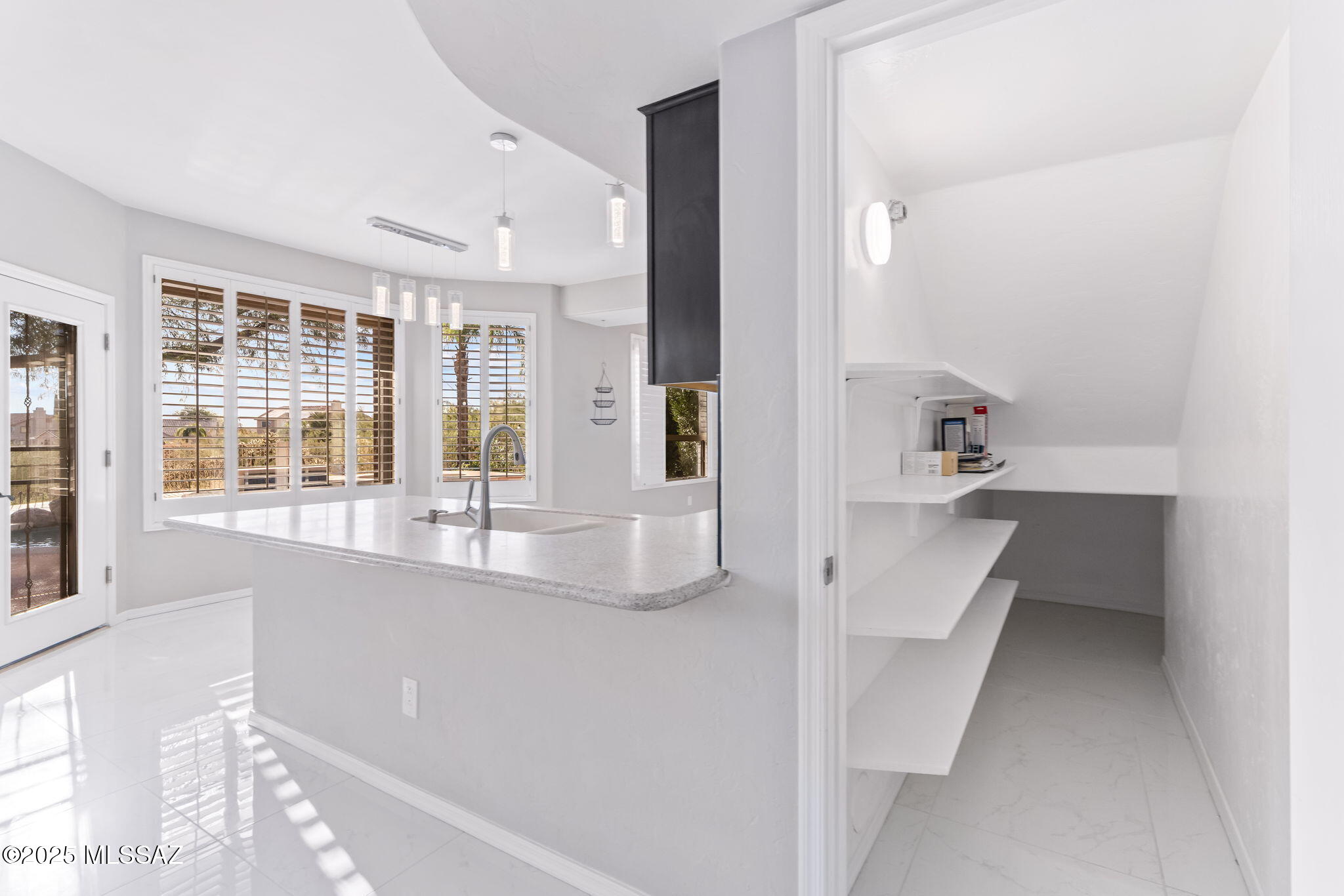 Tucked away on an end lot in a cul de sac with the convenience and amenities of Oro Valley at your fingertips - welcome to 2025 W Golden Rose Place. With open space behind and a magnificent backyard, outdoor living is at the forefront of this residential experience. Layer in the enjoyment of a quiet park next door that functions like an extension of this lot. Recently renovated, the property features 3 bedrooms, 2 1/2 baths, plus a den, spread over 2,451 sq ft. Oversized windows create light filled spaces, complemented by a clean and contemporary palette. A few of the upgraded features include large format porcelain tiles, luxury lighting, and a custom primary closet. Enjoy seeing greenery out the windows and Catalina Mountain views from the upper deck off the primary suite. The backyard is a desert sanctuary with excellent privacy and amenities. With a large swimming pool, in ground spa, expansive turf area, and plenty of areas for seating, there are many ways to enjoy the space. With no rear neighbors, open views to the green space behind showcase colorful sunsets.