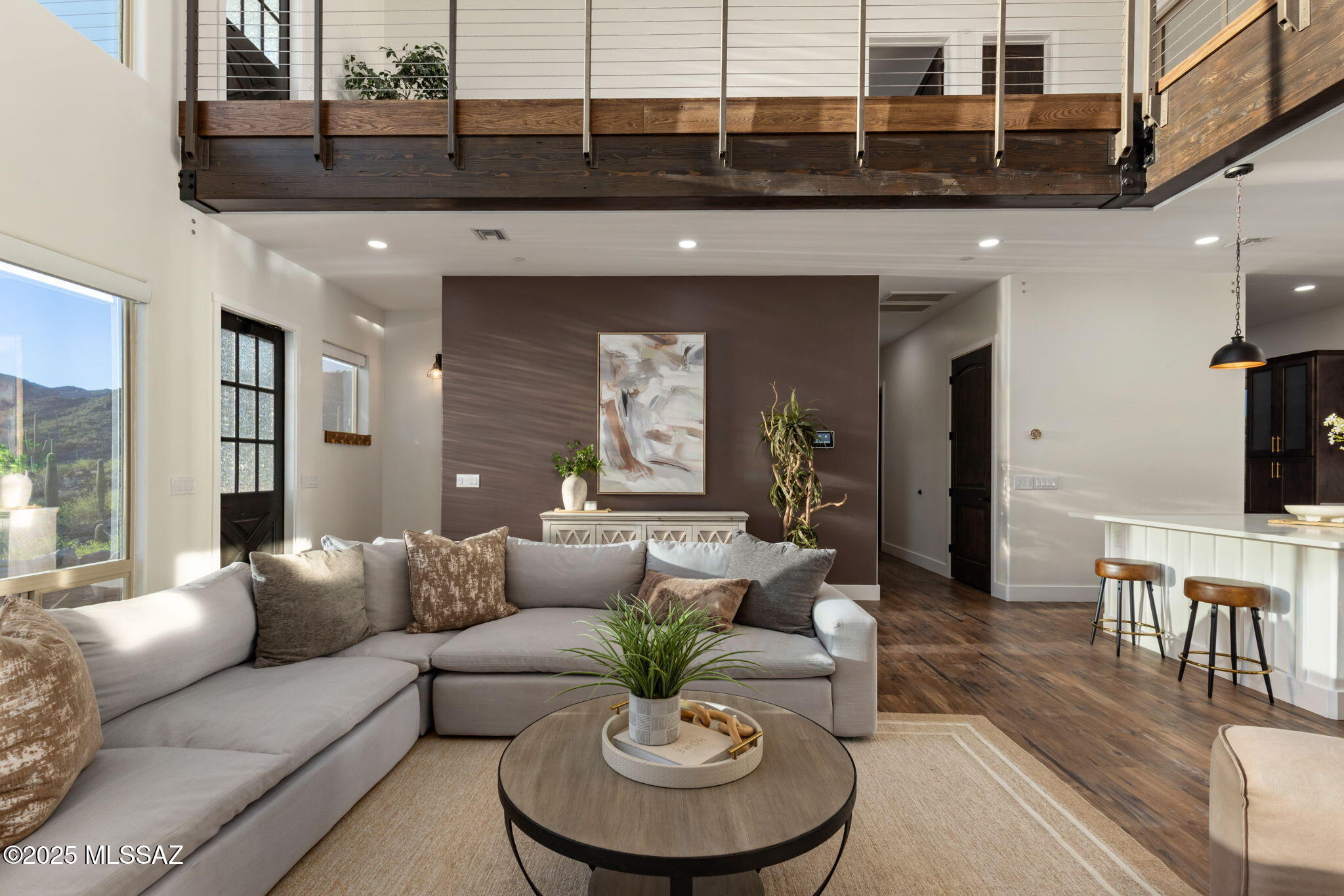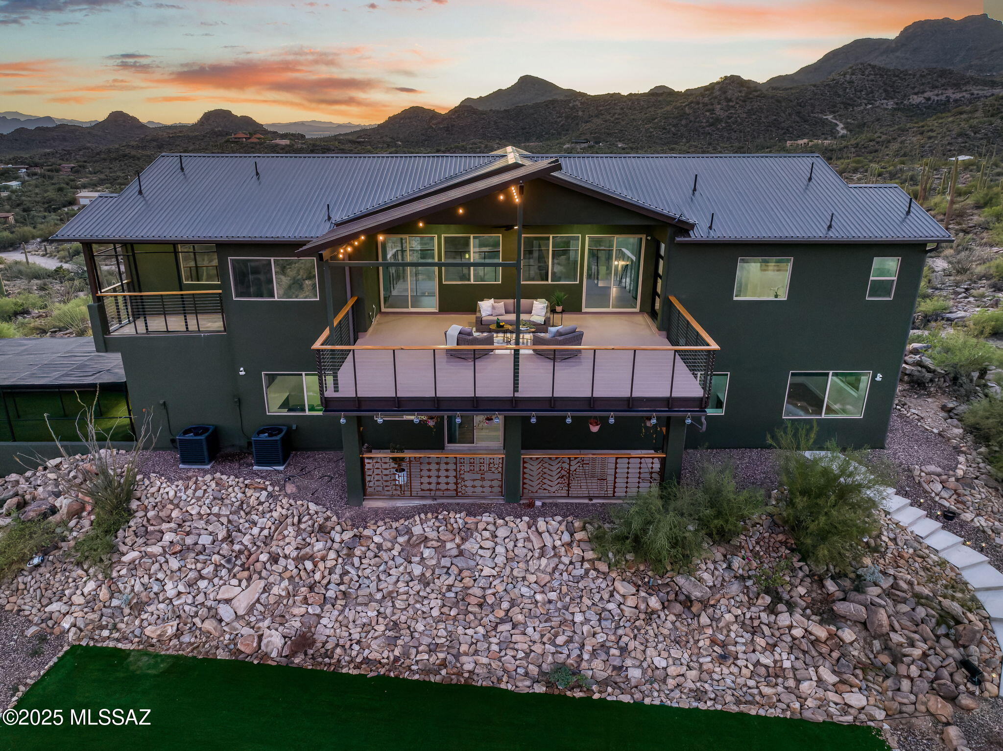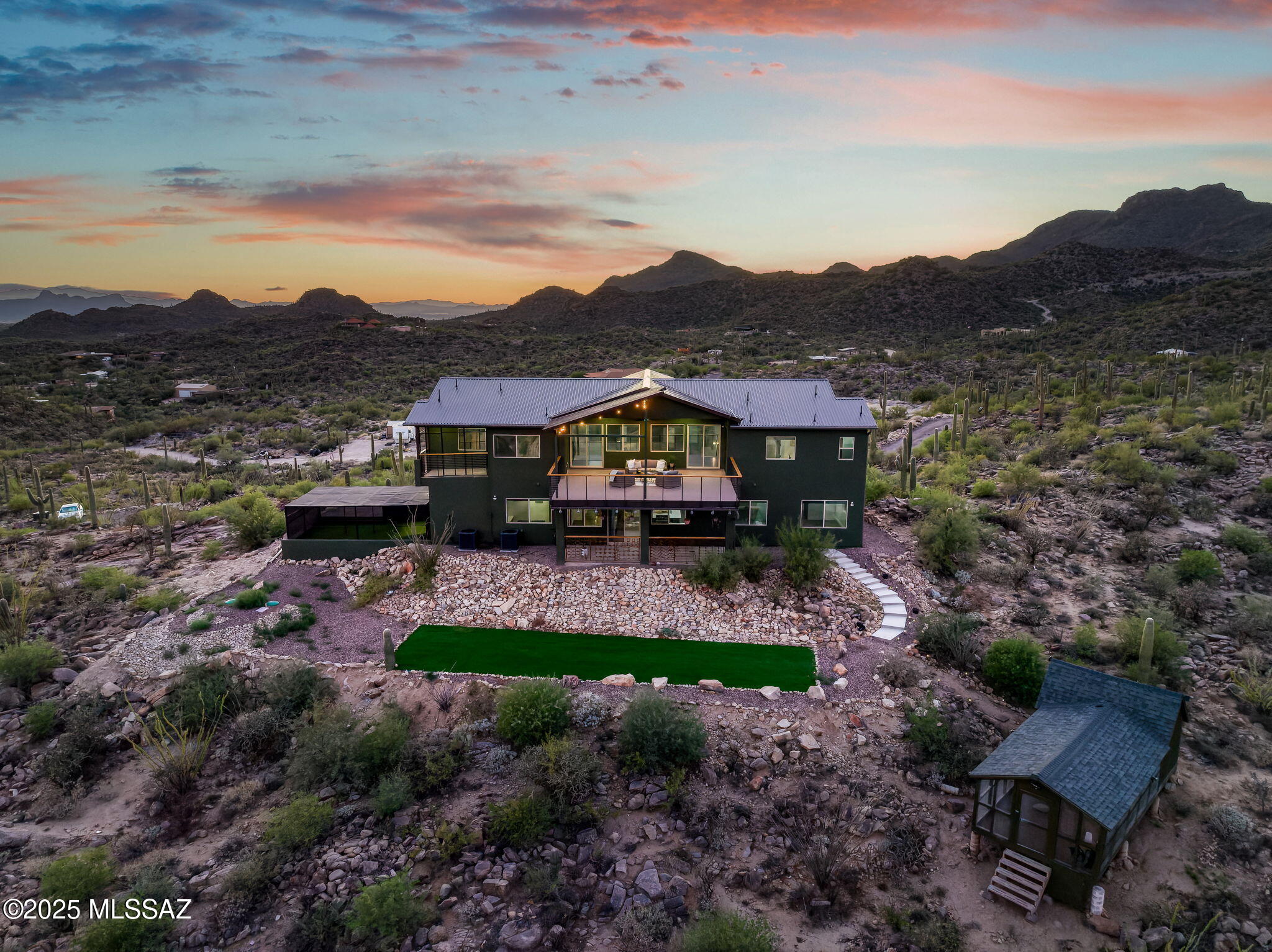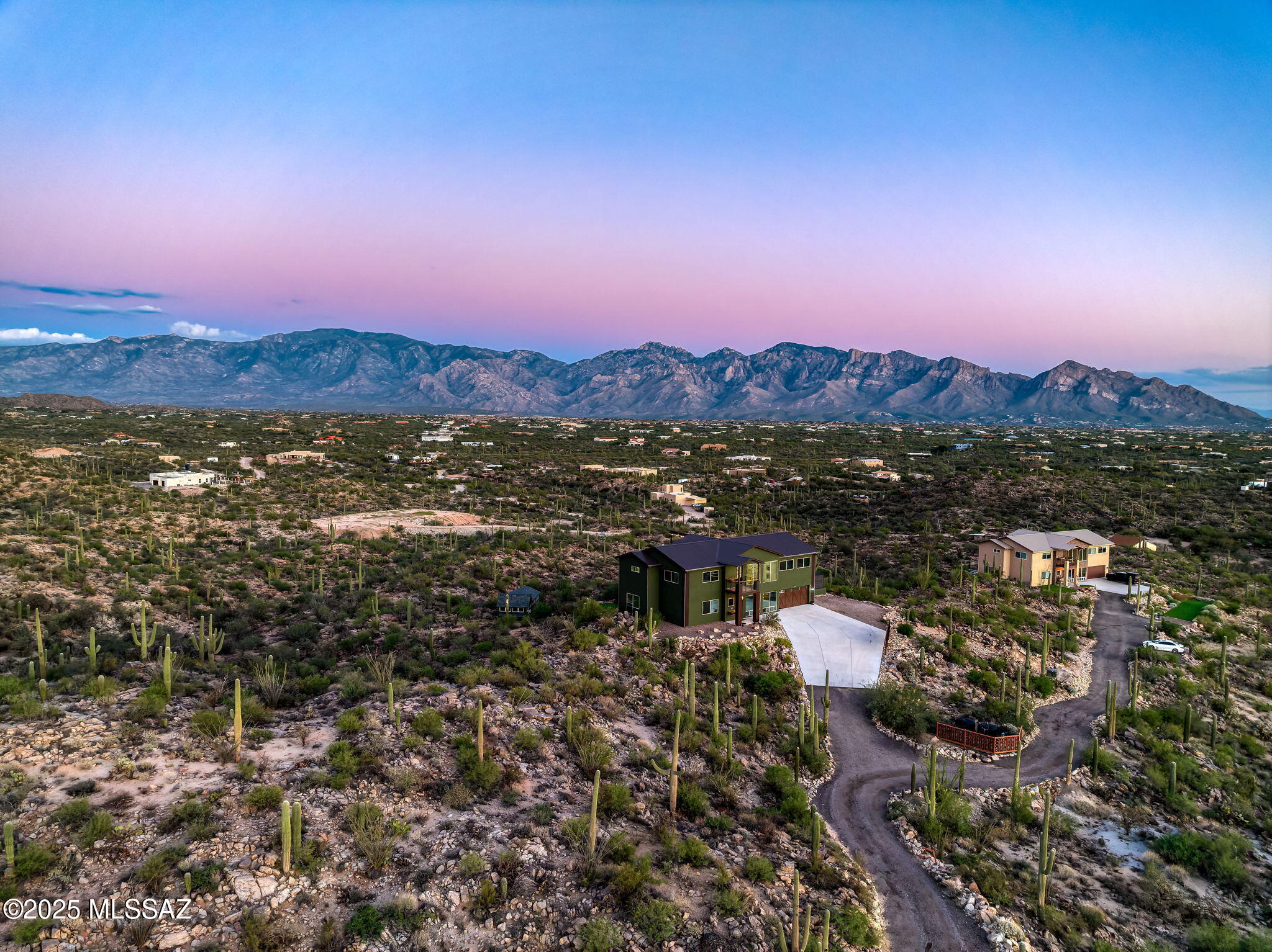Experience life in the Sonoran Desert surrounded by panoramic vistas of multiple mountain ranges, sunsets and open spaces. 14192 N Gecko Canyon Trail offers a turn-key residence in a relaxed setting with no HOA. Here, on this elevated 5-acre parcel, the air at 3,000 ft is a bit cooler and the views are expansive. While this rural setting welcomes chickens and horses, it takes less than 15 minutes to access a large grocery store and under 20 minutes to reach Oro Valley Hospital & medical complex. Entering through a private road and electric entry gate, there is a feeling of seclusion and calm. Completed in 2024, the property is fresh, light, bright and ready to enjoy. A thoughtful 3,592 sq ft floor plan includes a lower level with large gathering areas, 2 bedrooms and a full bath, while the upper level includes dual primary suites and a pocket gym. Dramatic touches include double height spaces, a floor to ceiling stone clad fireplace and oversized windows with electric custom blinds. Functional and durable materials include LVP floors, quartz counters and a metal roof system with spray foam insulation.