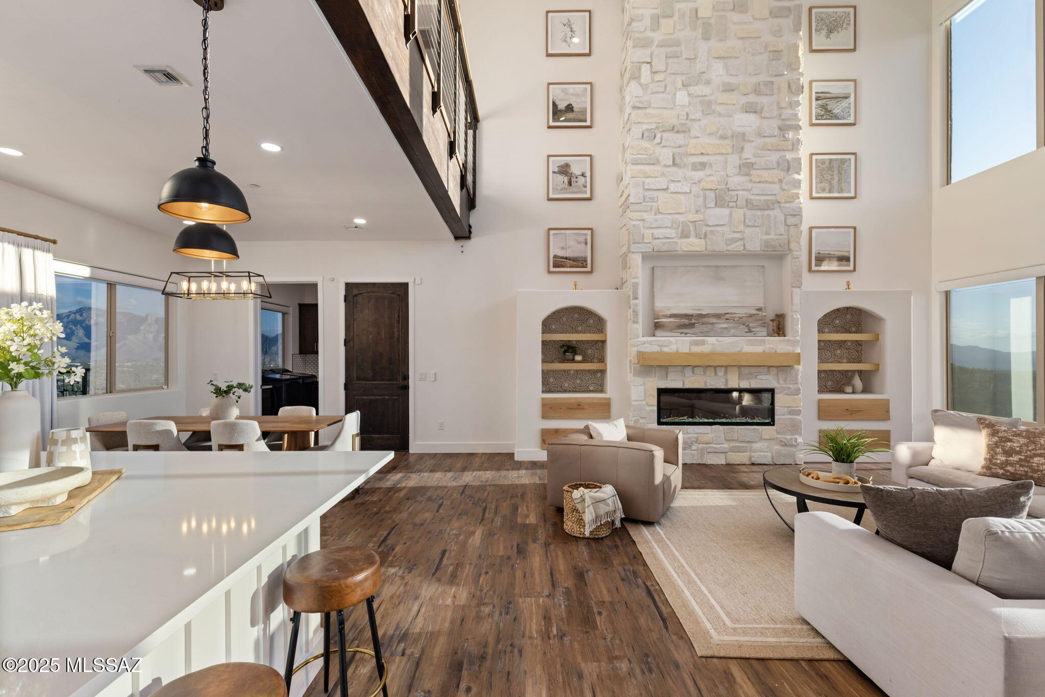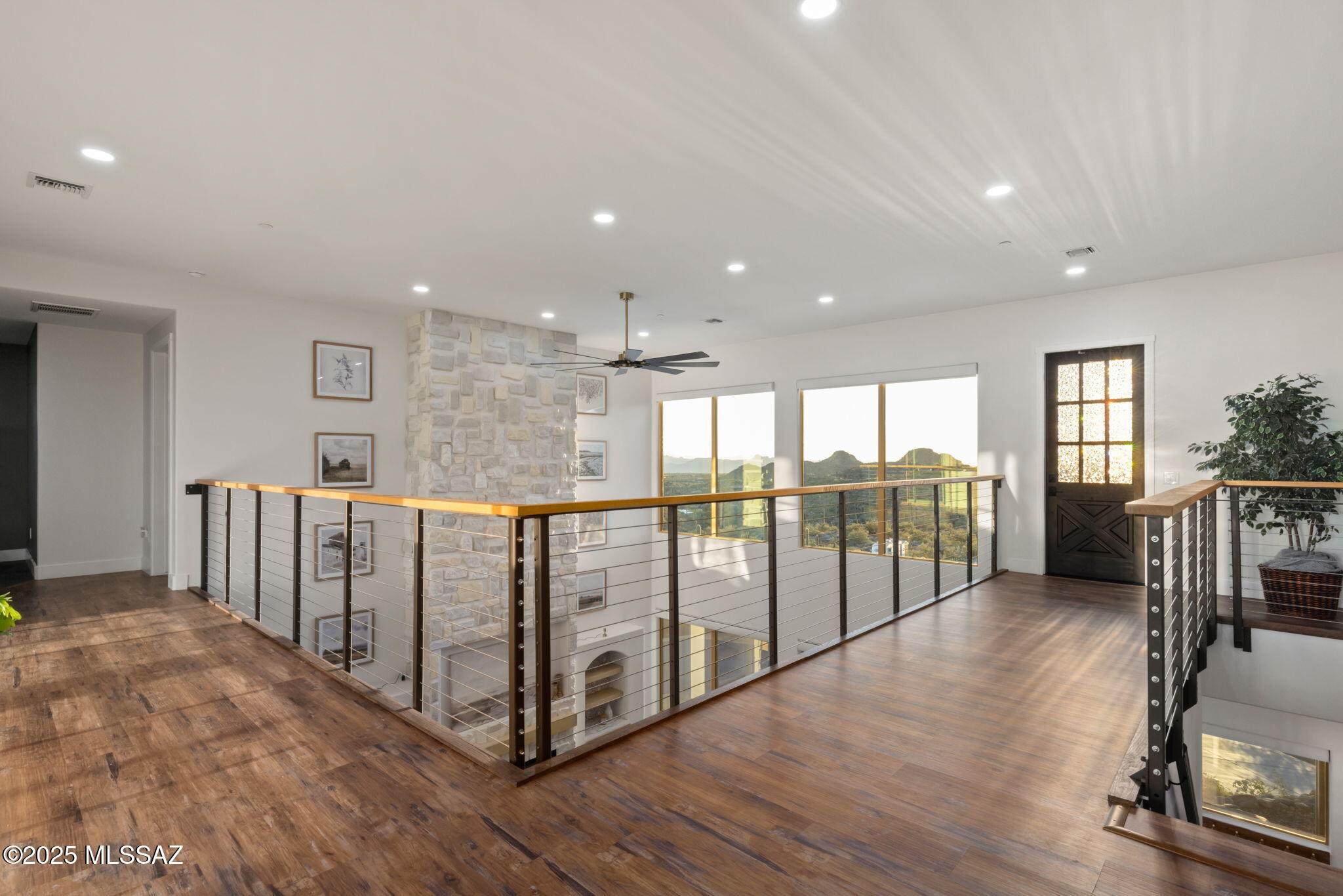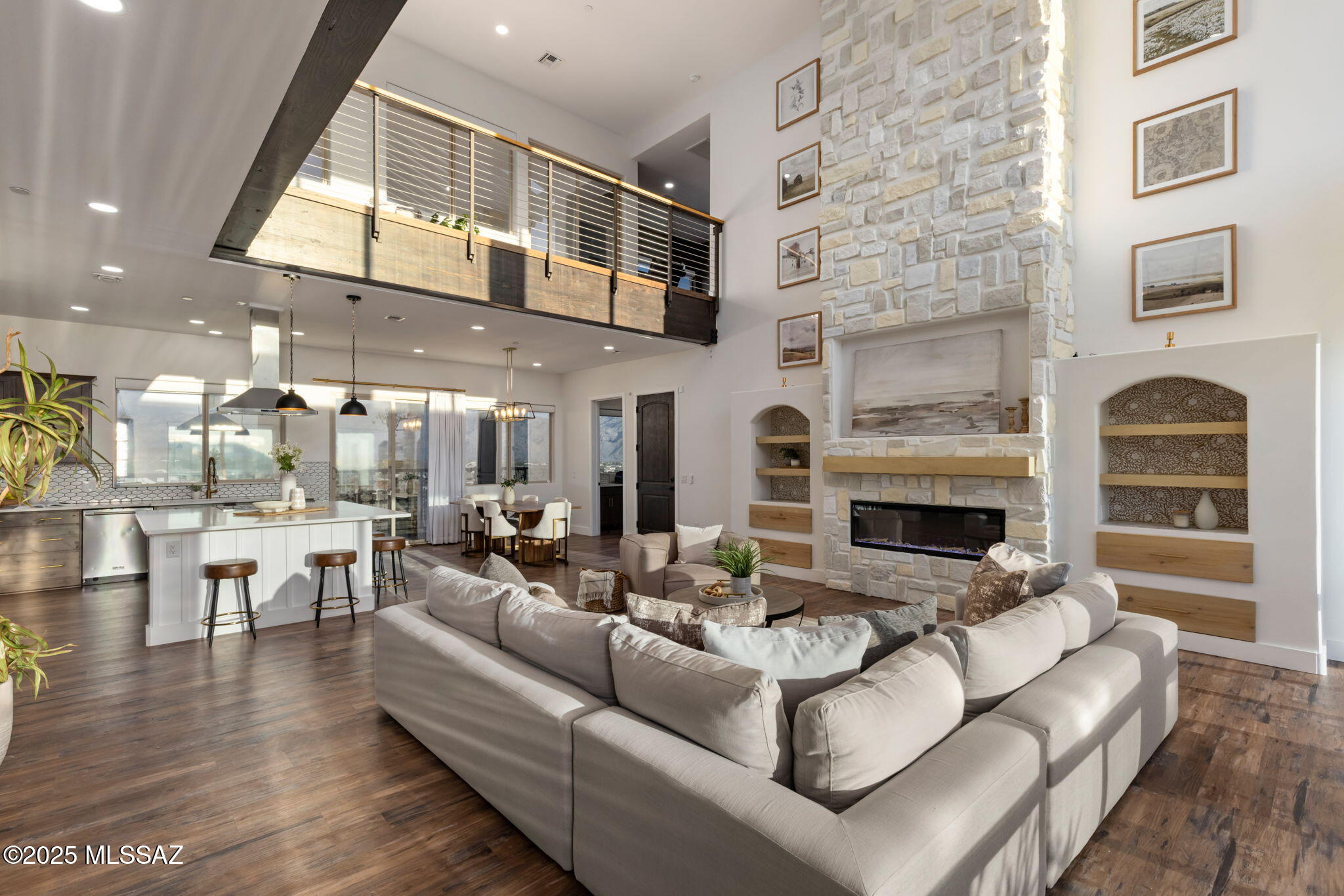Experience life in the Sonoran Desert surrounded by panoramic vistas of multiple mountain ranges, sunsets and open spaces. 14192 N Gecko Canyon Trail offers a turn-key residence in a relaxed setting with no HOA. Here, on this elevated 5-acre parcel, the air at 3,000 ft is a bit cooler and the views are expansive. While this rural setting welcomes chickens and horses, it takes less than 15 minutes to access a large grocery store and under 20 minutes to reach Oro Valley Hospital & medical complex. Entering through a private road and electric entry gate, there is a feeling of seclusion and calm. Completed in 2024, the property is fresh, light, bright and ready to enjoy. A thoughtful 3,592 sq ft floor plan includes a lower level with large gathering areas, 2 bedrooms and a full bath, while the upper level includes dual primary suites and a pocket gym. Dramatic touches include double height spaces, a floor to ceiling stone clad fireplace and oversized windows with electric custom blinds. Functional and durable materials include LVP floors, quartz counters and a metal roof system with spray foam insulation.